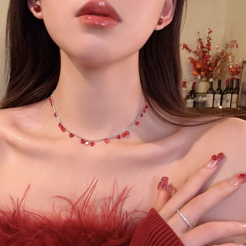 轻奢小众红色水晶流苏钛钢项链饰品女辣妹百搭高级感满天星锁骨链