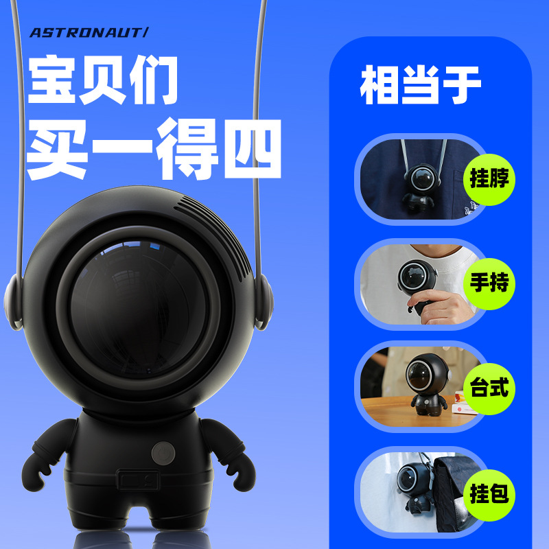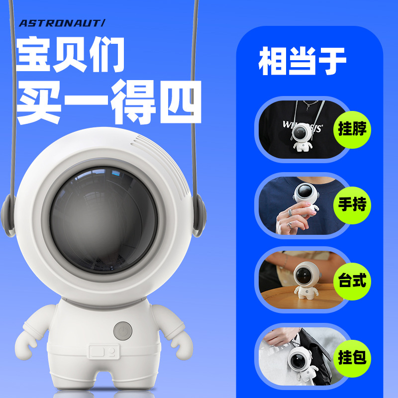 跨境新款迷你USB充电挂脖手持太空人小电风扇无叶便携卡通宇航员