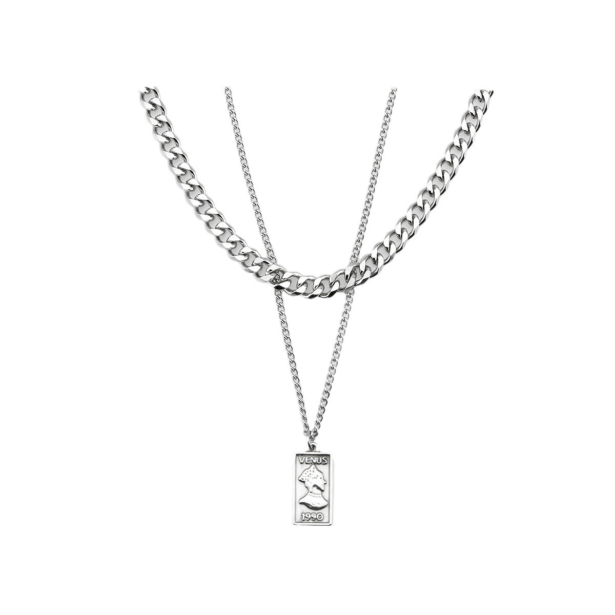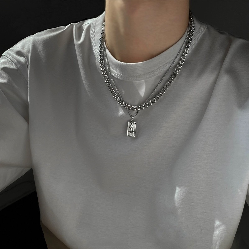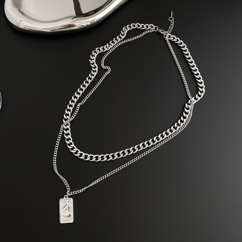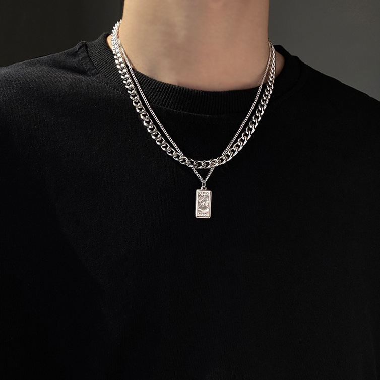 双层叠戴复古方牌人头像吊坠钛钢项链男士百搭不掉色高级感锁骨链