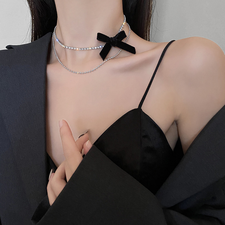 辣妹小众纯欲风丝绒蝴蝶结项链饰品女百搭双层镶钻性感锁骨链配饰