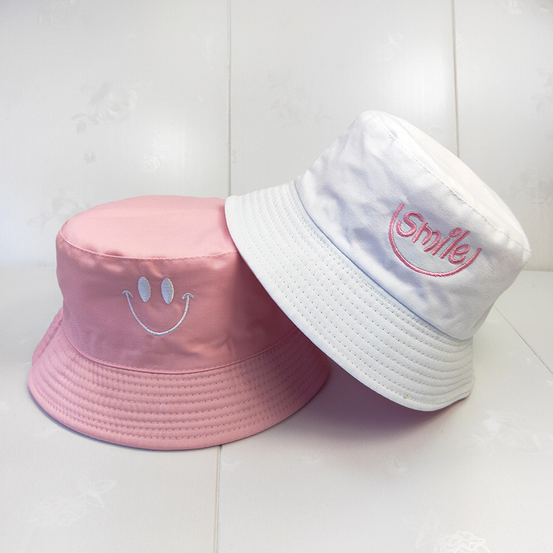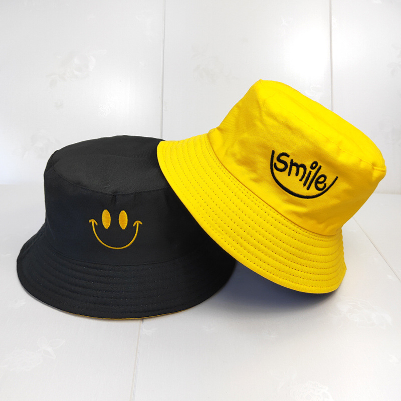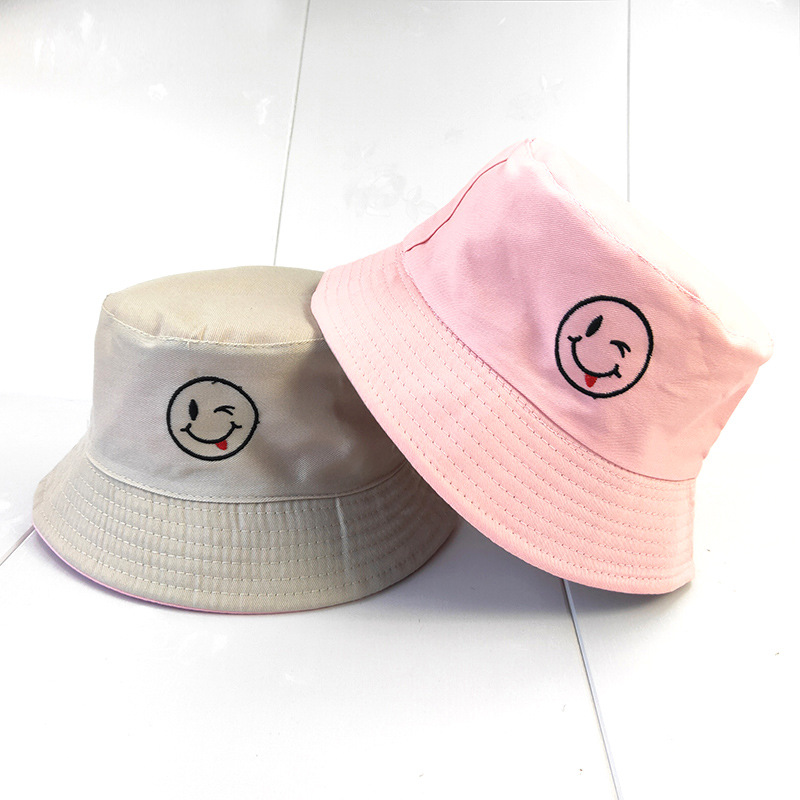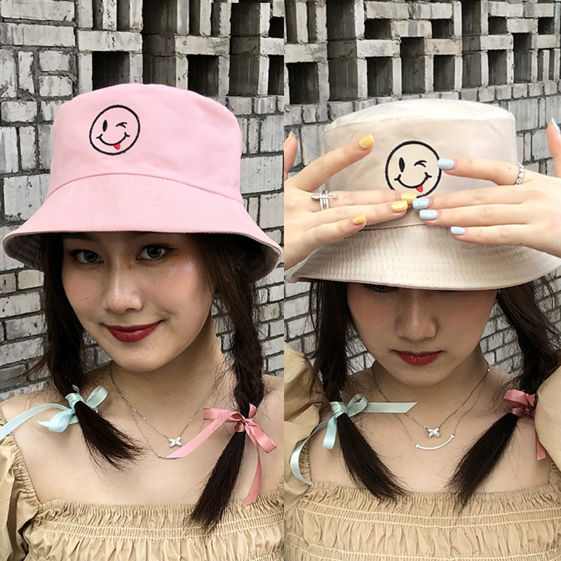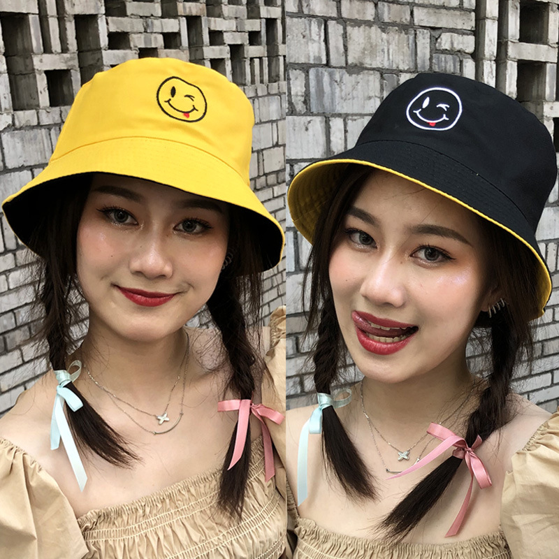 新款创意韩版双面戴刺绣笑脸渔夫帽情侣搞怪文字户外休闲盆帽潮帽