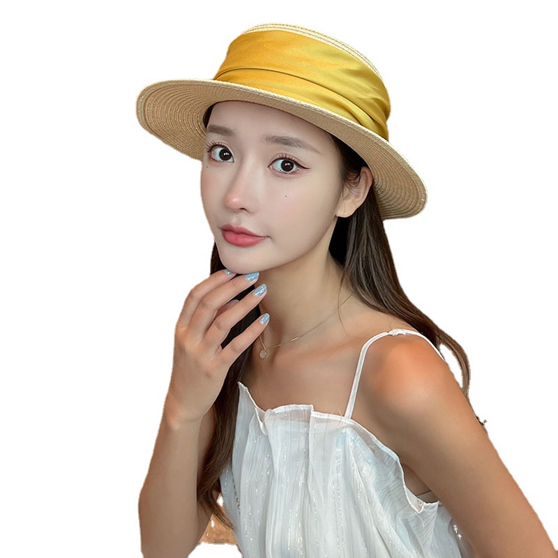 设计师法式绸缎气质礼帽褶皱织带草帽女夏季防晒遮阳帽度假太阳帽