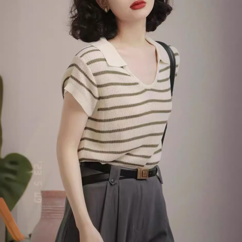 复古V领短袖针织衫条纹撞色设计感显瘦气质宽松上衣女夏