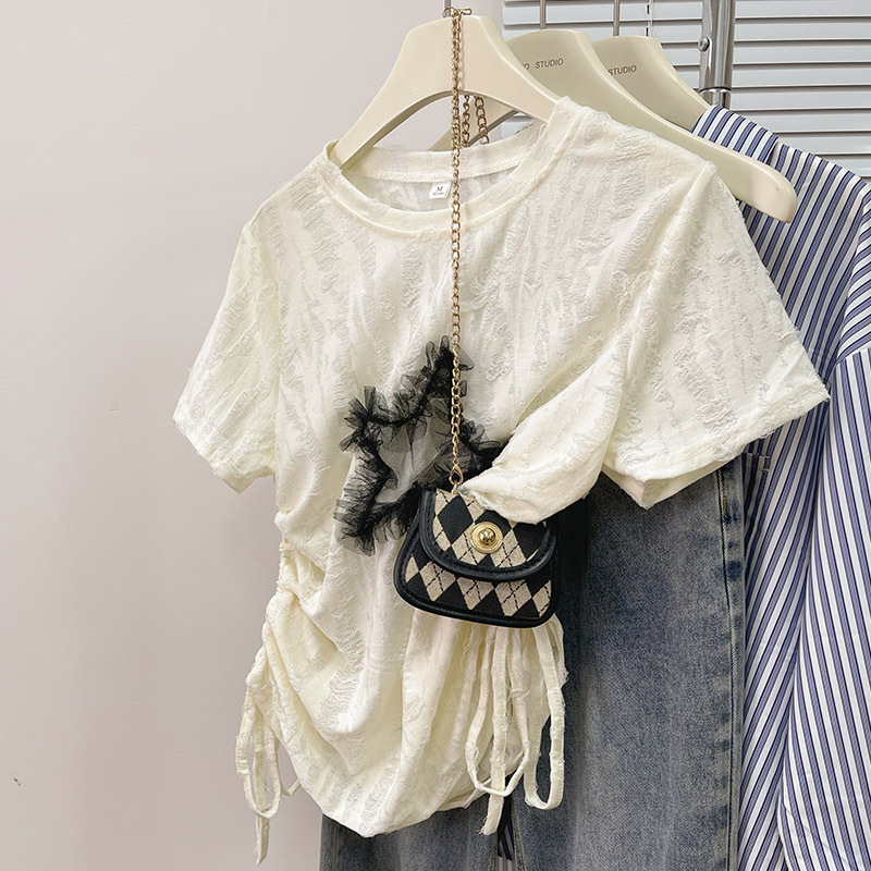 正肩抽绳星星短袖T恤女新款夏季设计感小众甜辣妹风半袖体恤