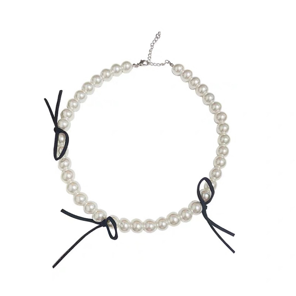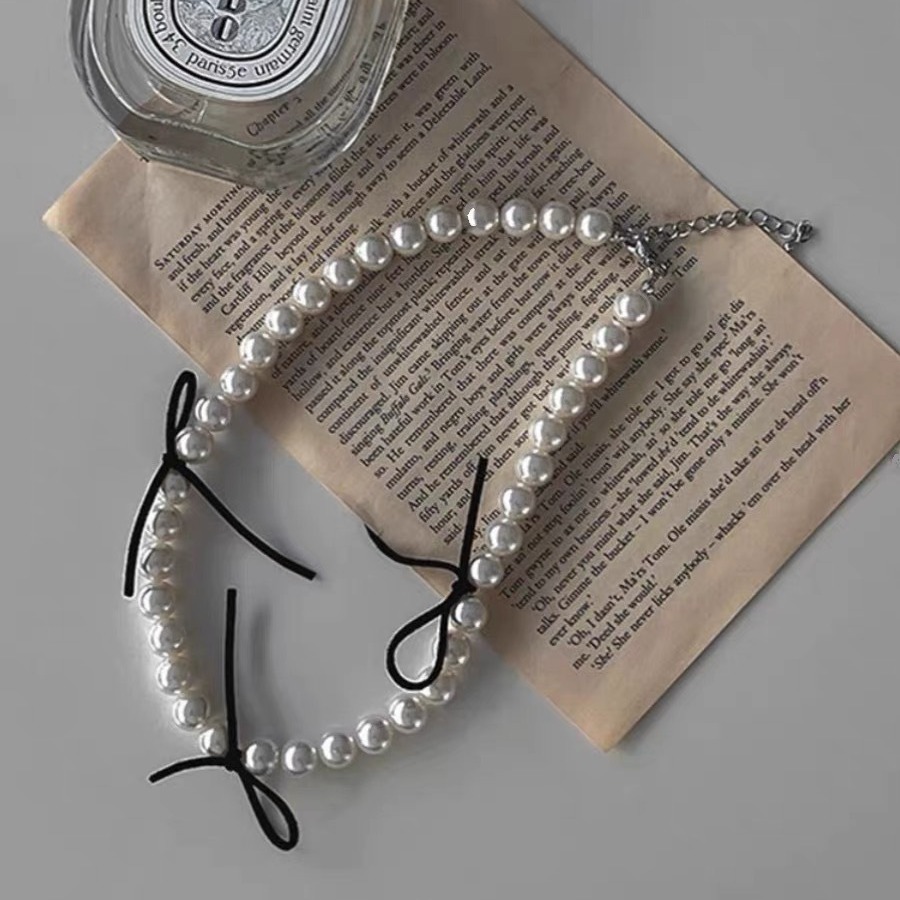 韩国复古绑带黑色蝴蝶结珍珠项链女轻奢小众甜酷风串珠锁骨链颈链