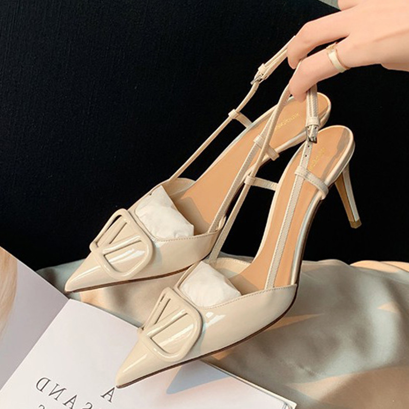 包头V扣裸色高跟鞋女细跟单鞋春夏新款性感一字带后空凉鞋