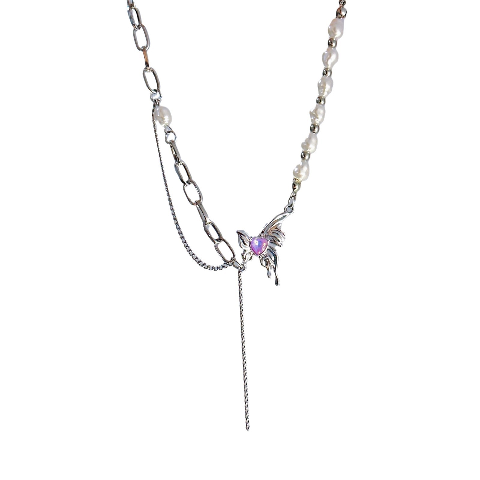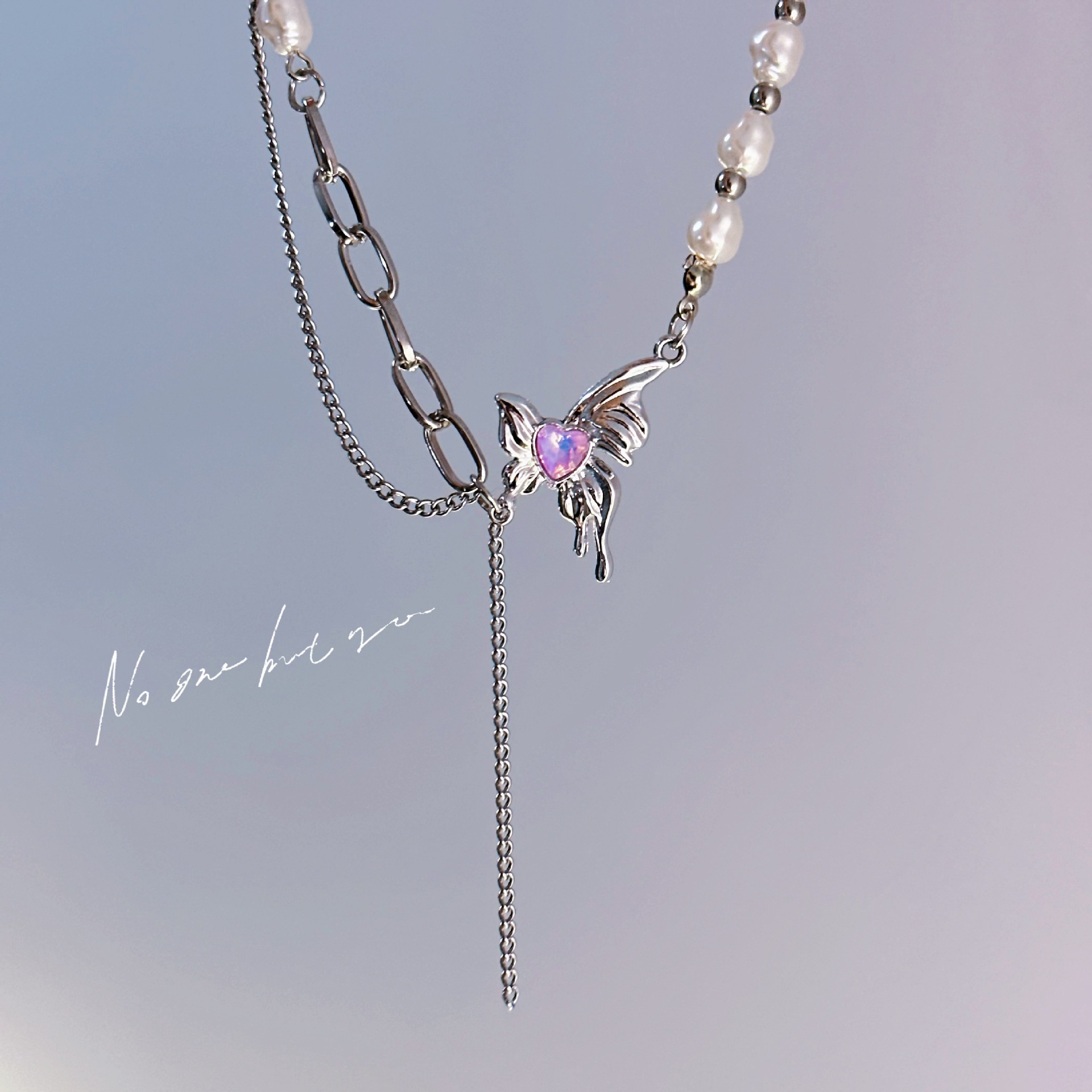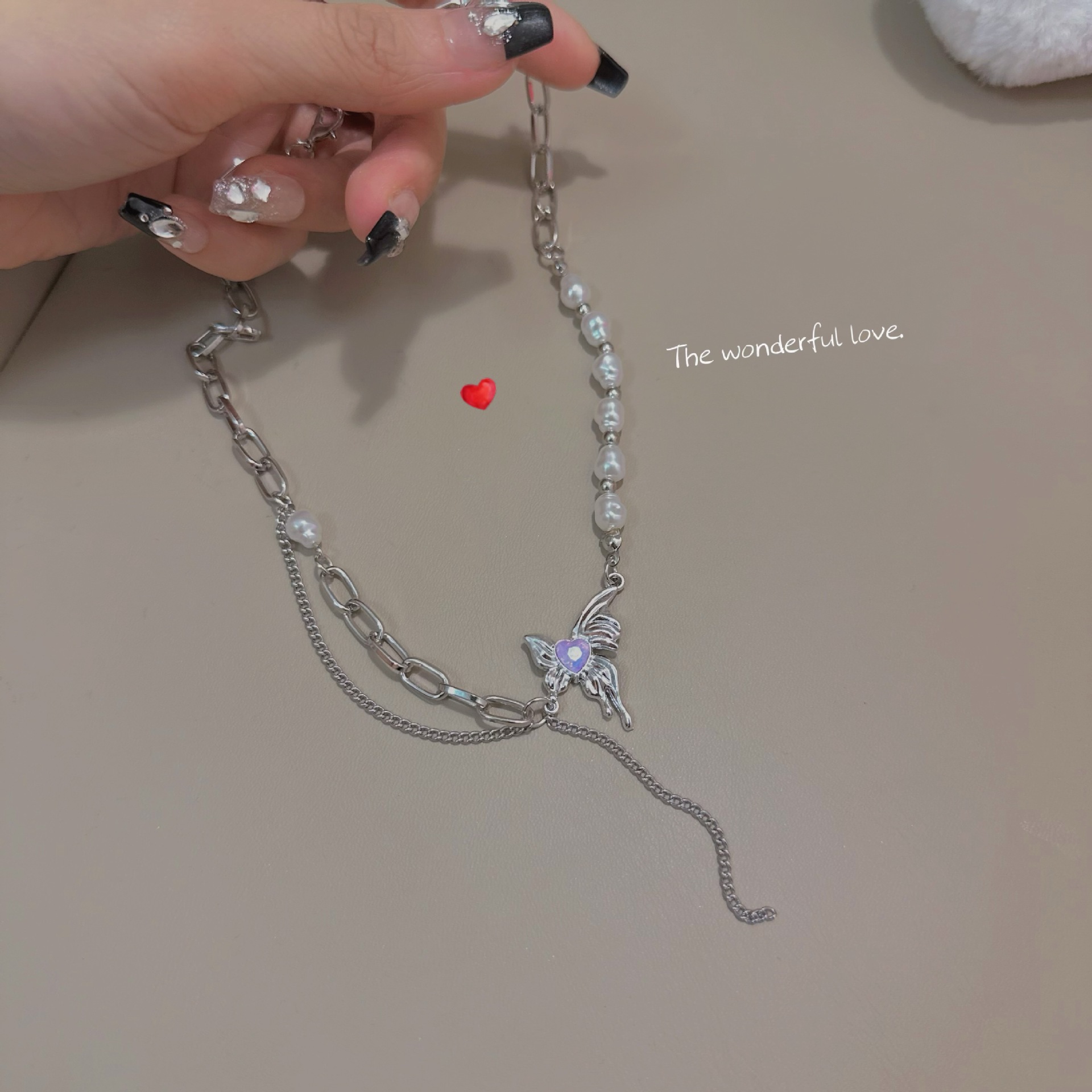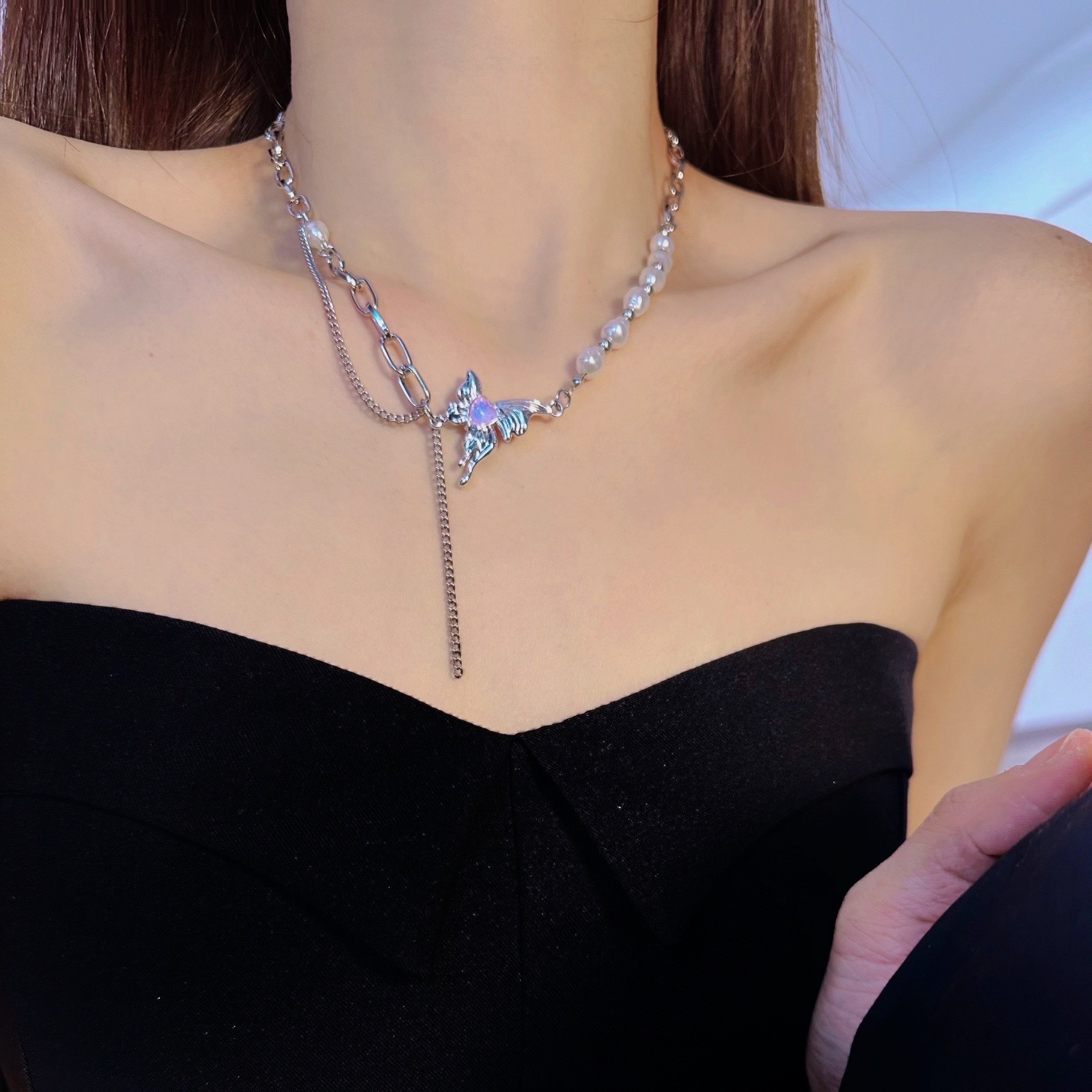 个性拼接甜酷风水晶蝴蝶珍珠项链饰品女百搭小众高级感流苏锁骨链