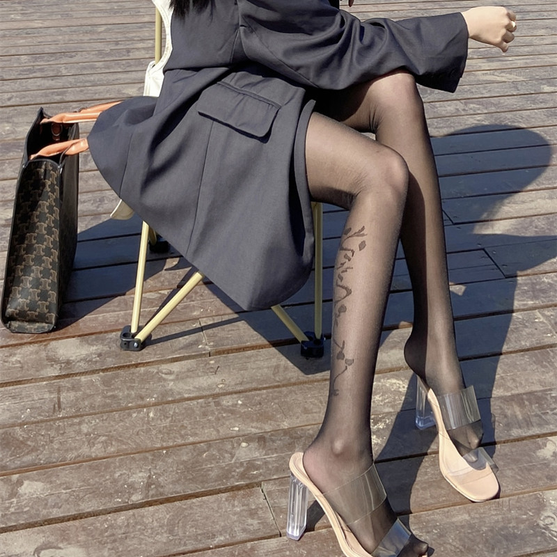 春夏日系性感薄款黑丝小腿刺绣提花连裤袜女白色可甜可闲打底丝袜