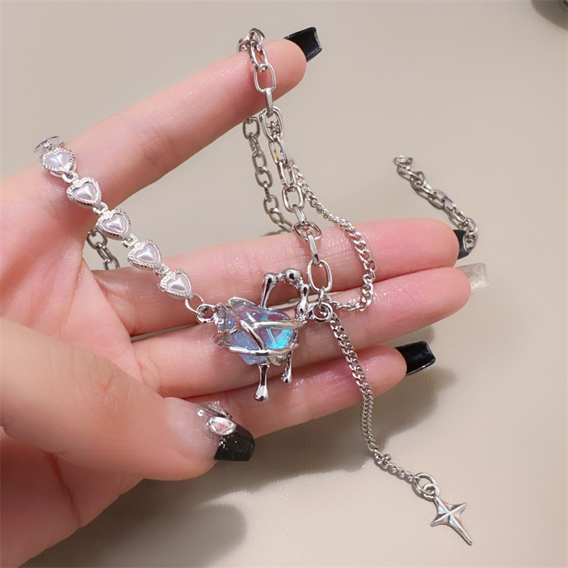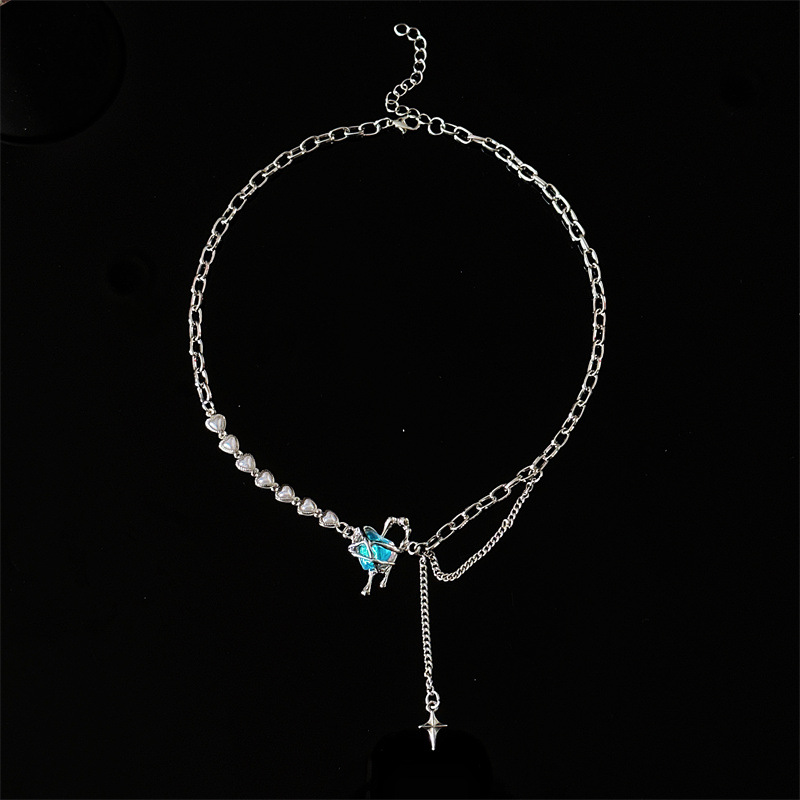 幻彩海蓝宝爱心珍珠拼接项链女多巴胺饰品百搭轻奢小众流苏锁骨链