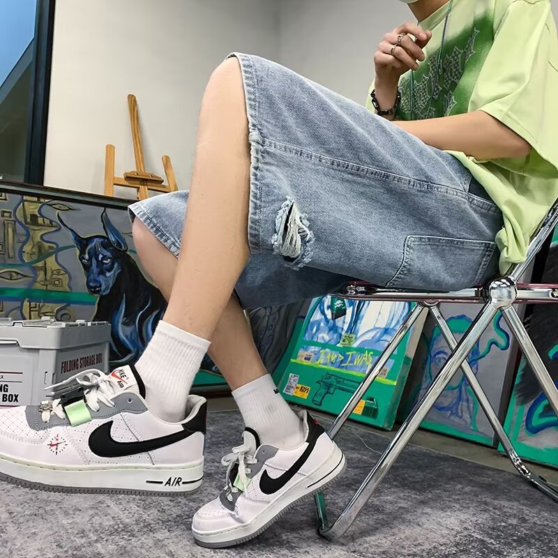 夏季牛仔短裤男士五分裤男款高街破洞直筒中裤5分裤马裤潮牌裤子