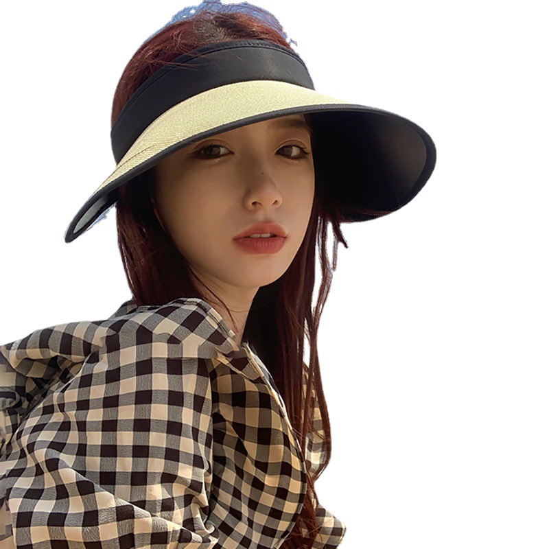 夏季UV黑胶防晒空顶帽女大檐草编遮阳帽出游海边百搭太阳帽沙滩帽