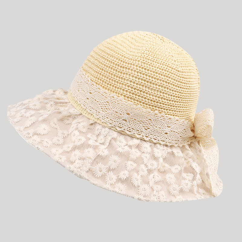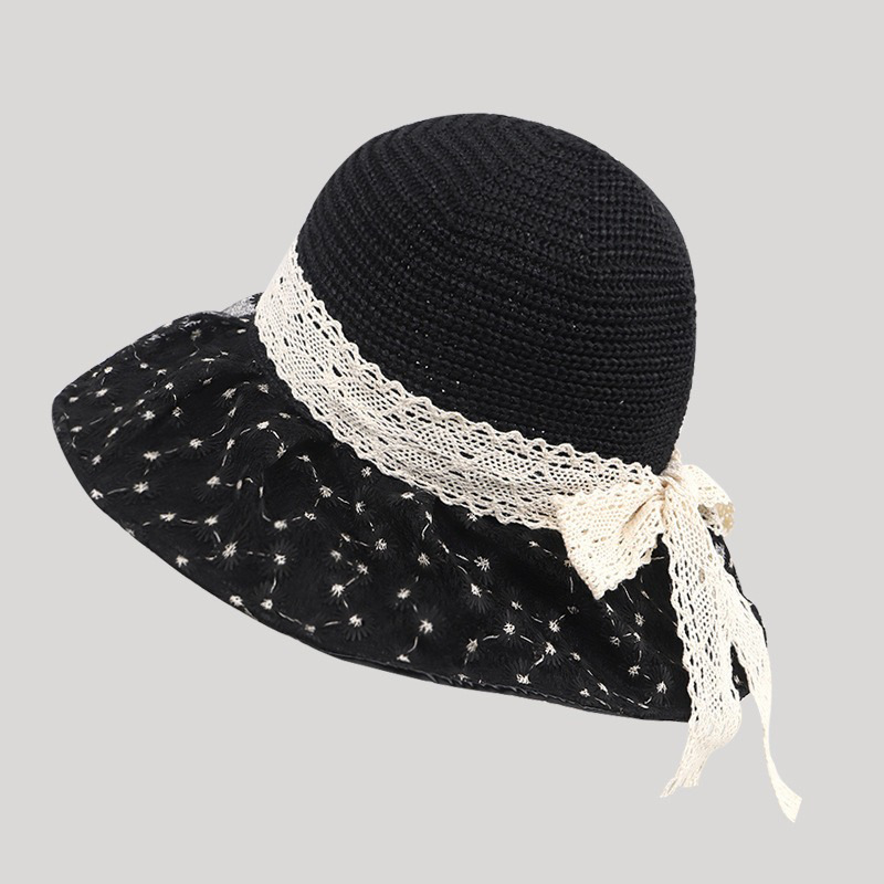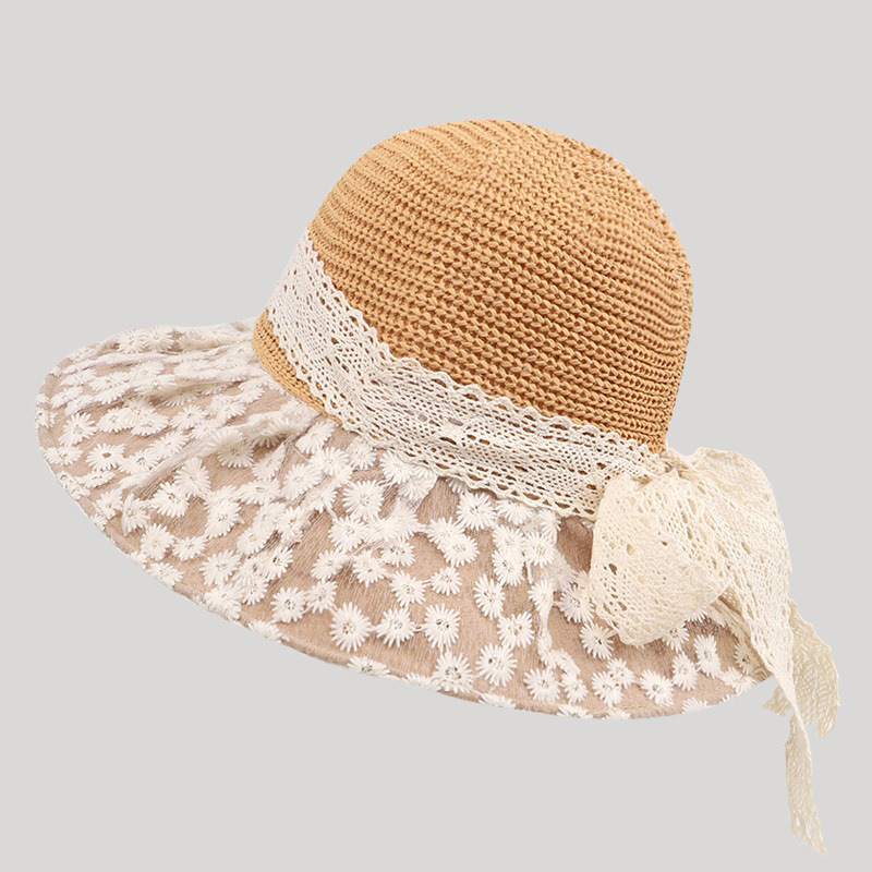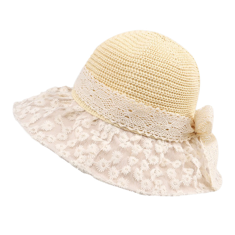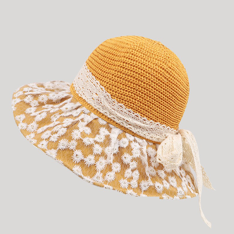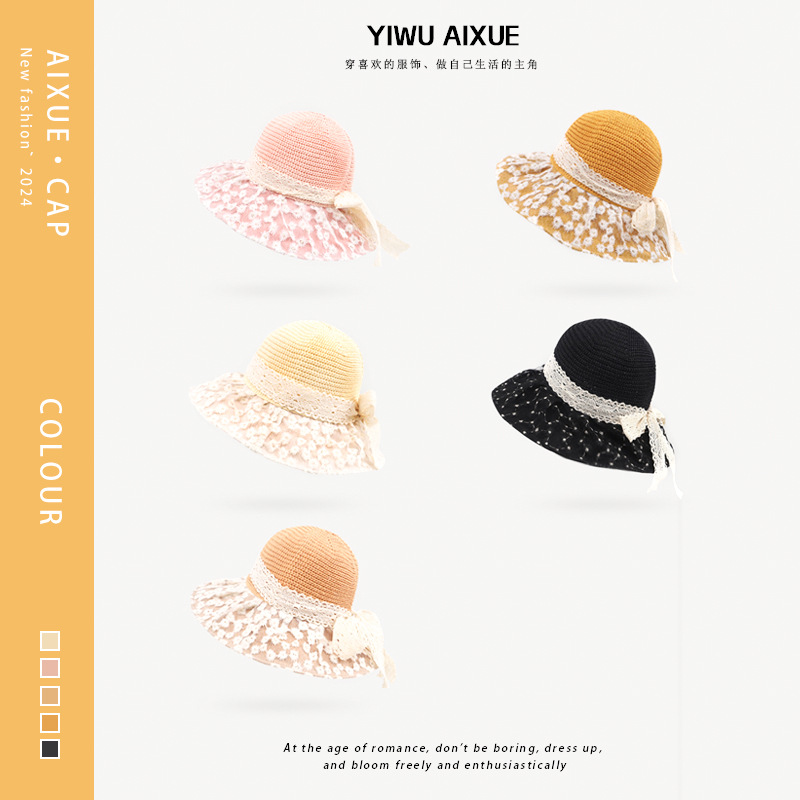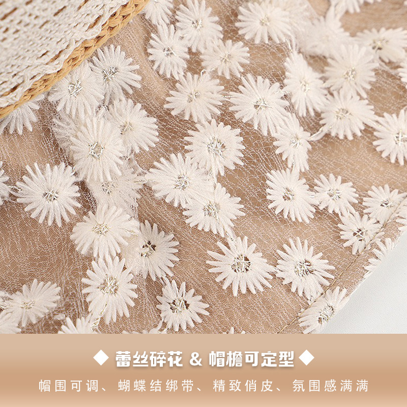 夏季新款沙滩帽女甜美气质网纱碎花渔夫帽飘带蝴蝶结显脸小遮阳帽