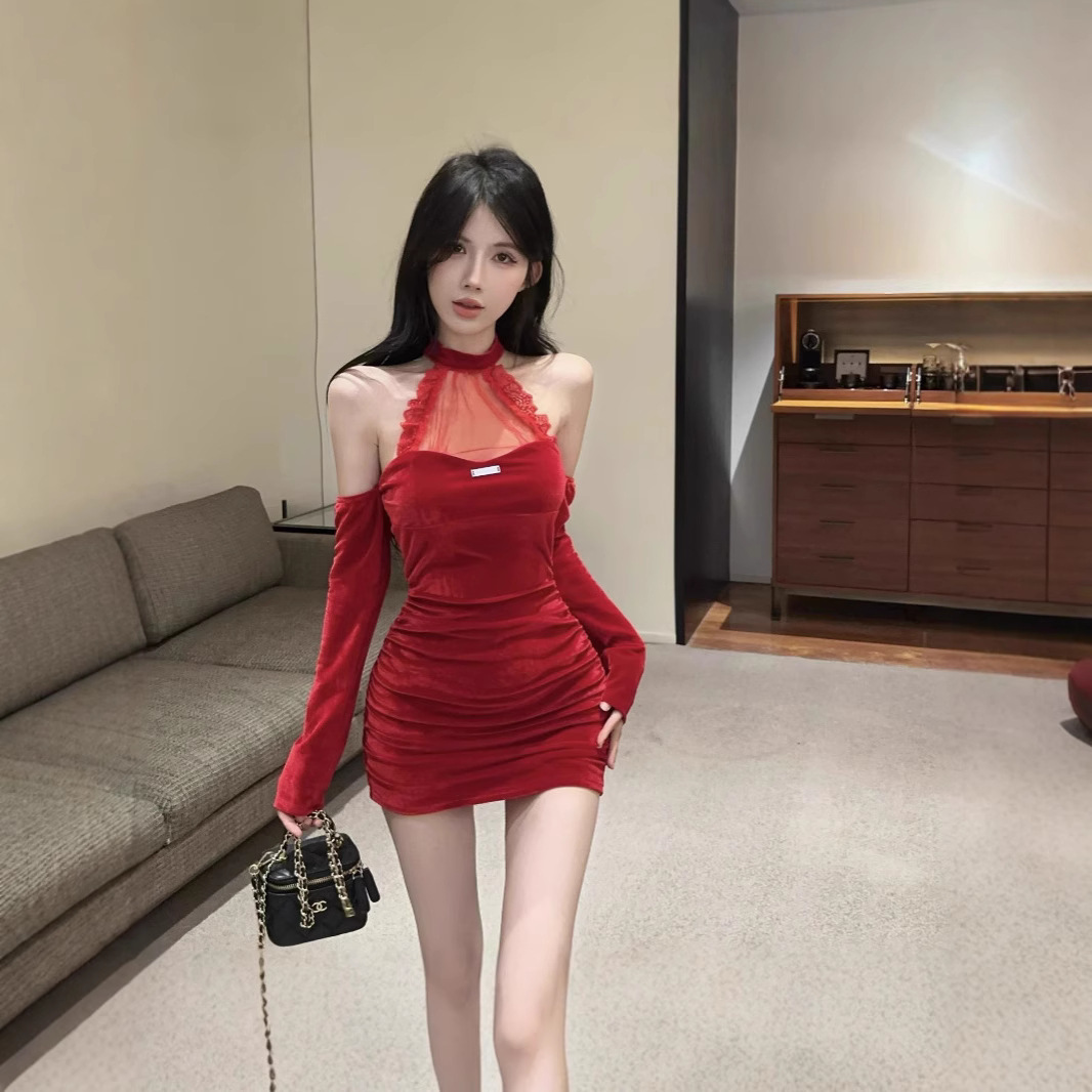 设计感纯欲气质挂脖网纱蕾丝花边褶皱露肩辣妹性感修身包臀连衣裙