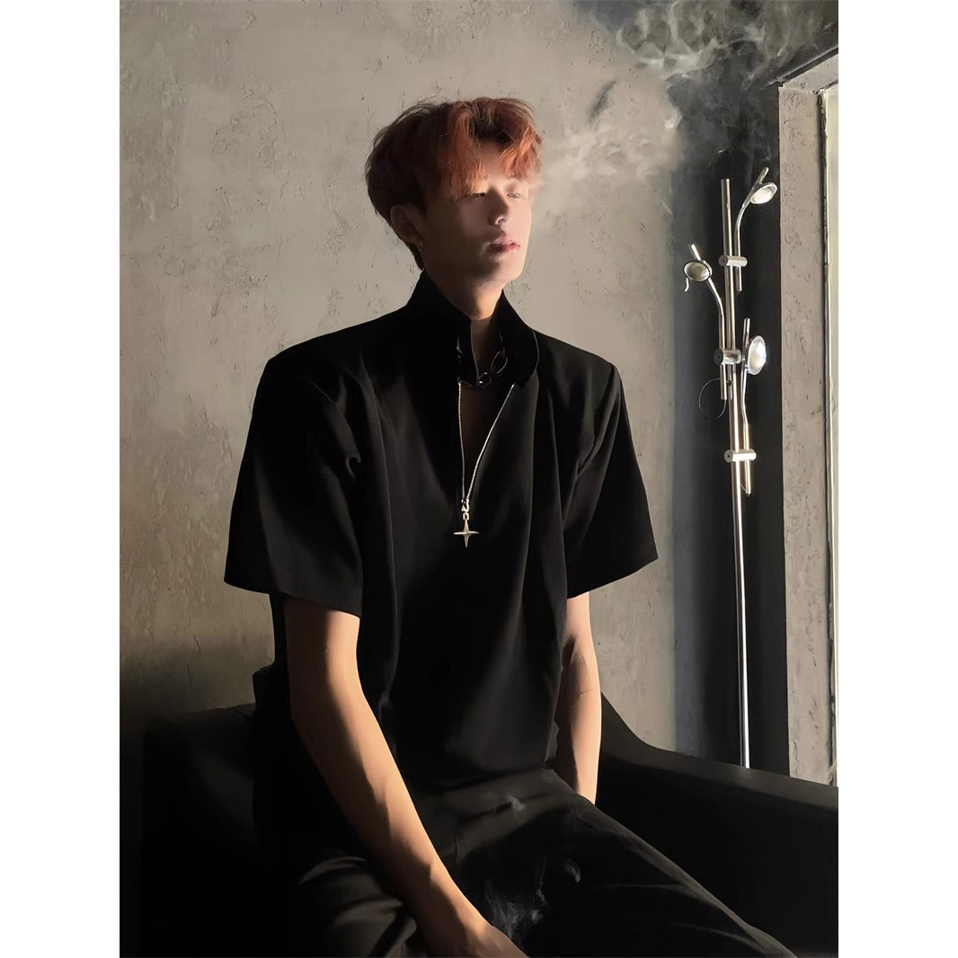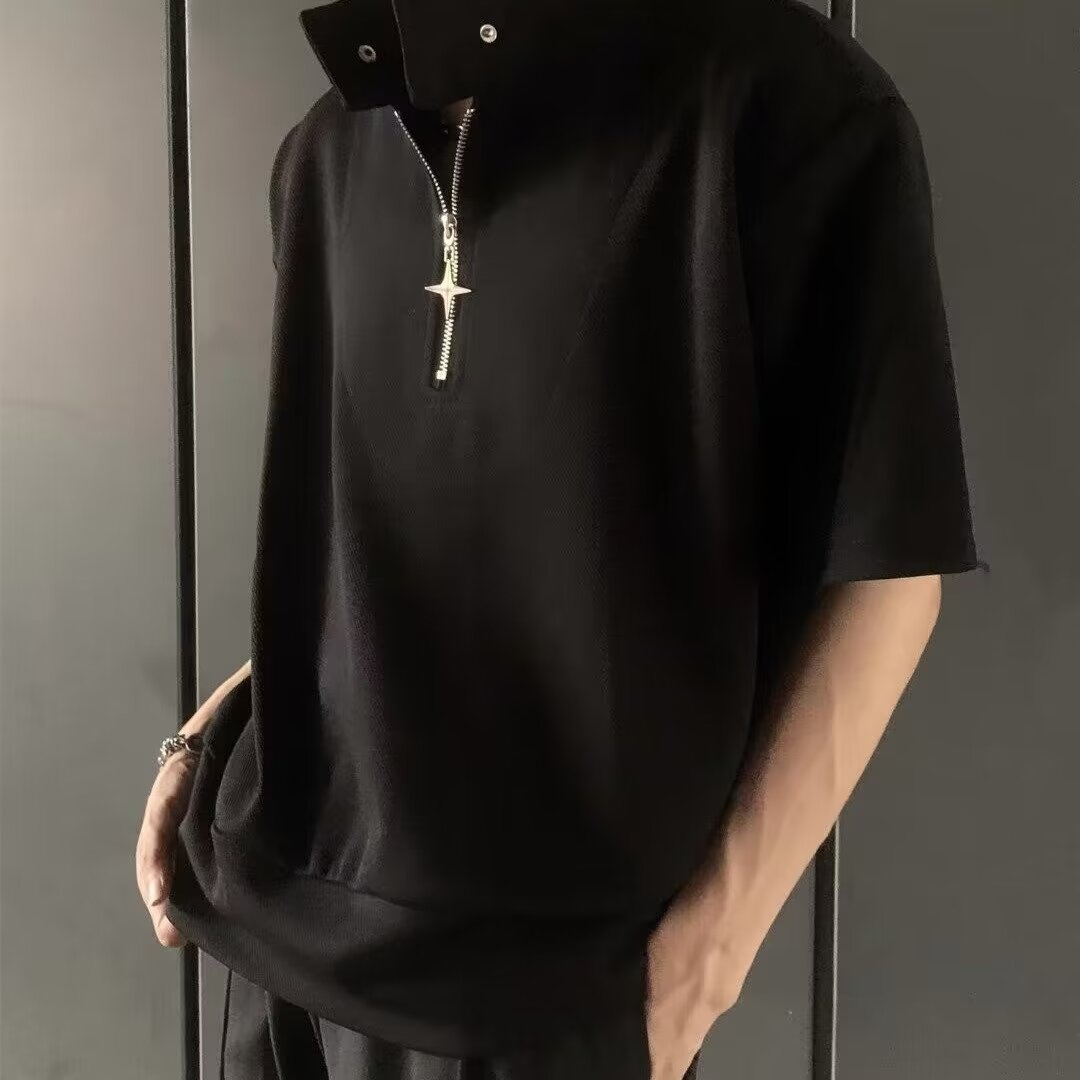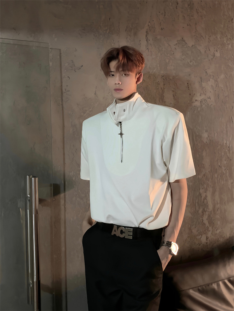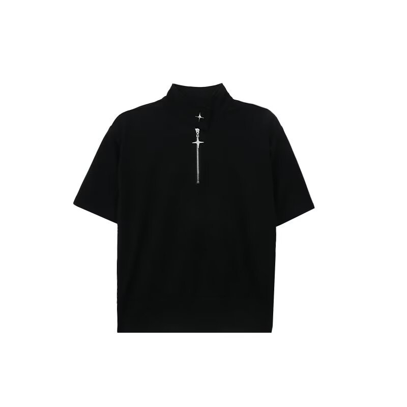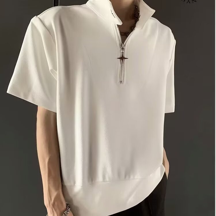 白色高级感立领金属拉链polo衫男士夏季潮牌设计感宽松短袖T恤衫