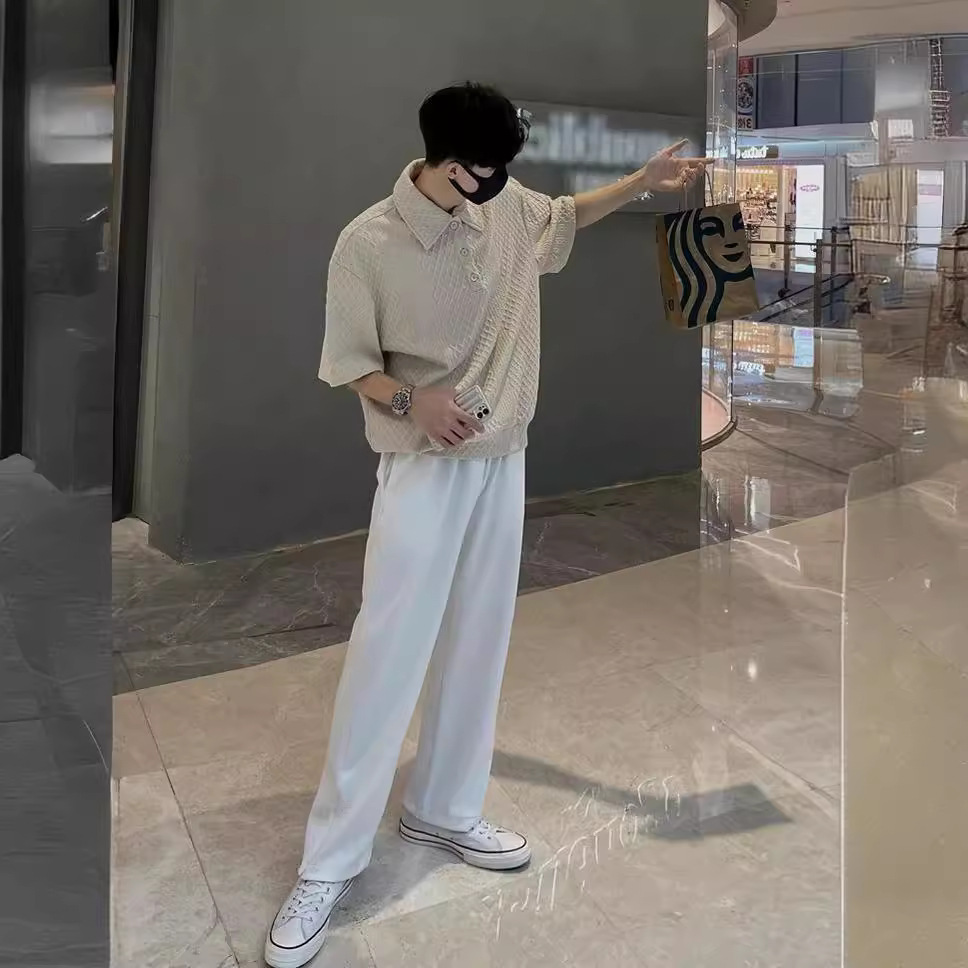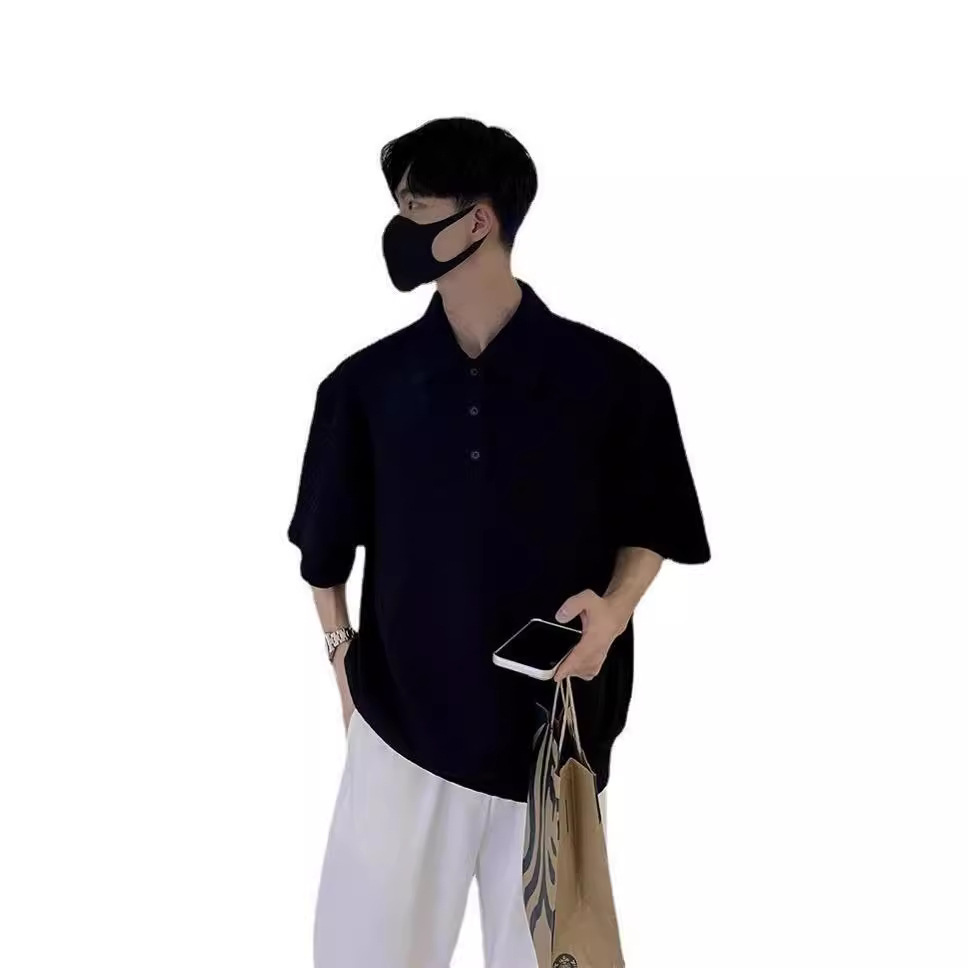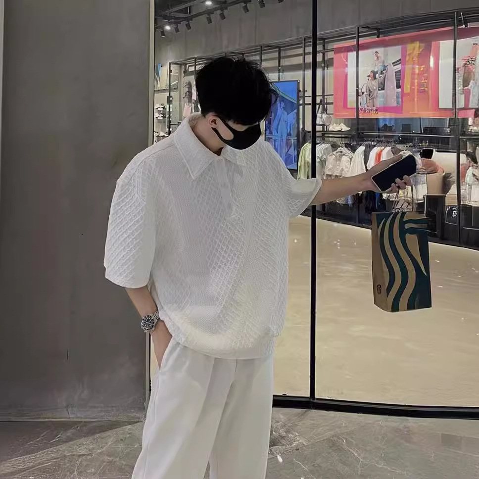 美式复古华夫格polo衫男潮牌宽松短袖翻领t恤设计感提花半袖卫衣