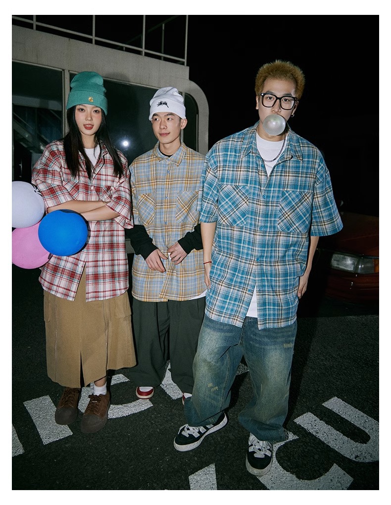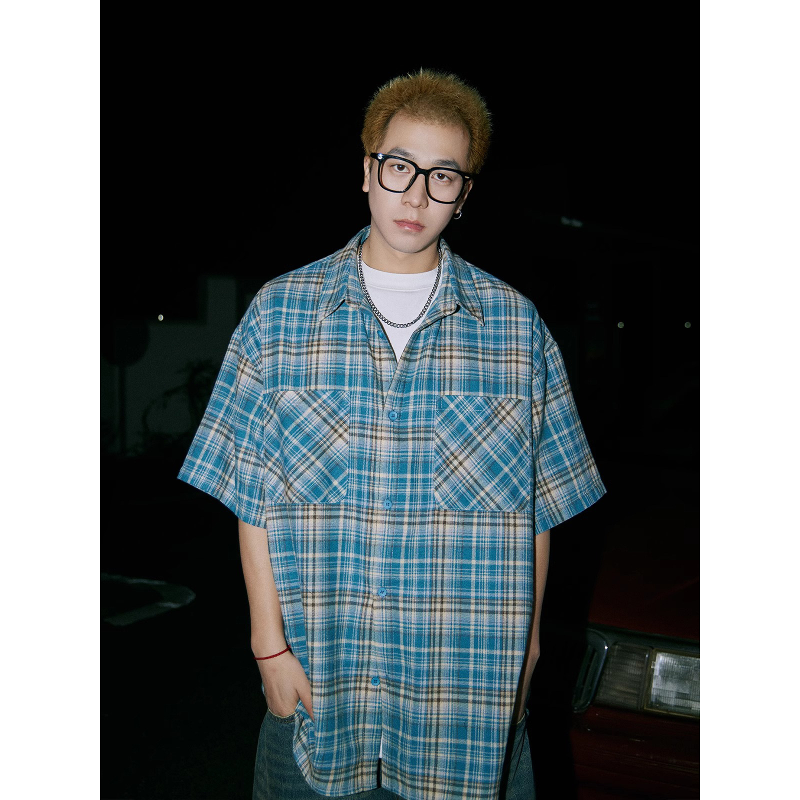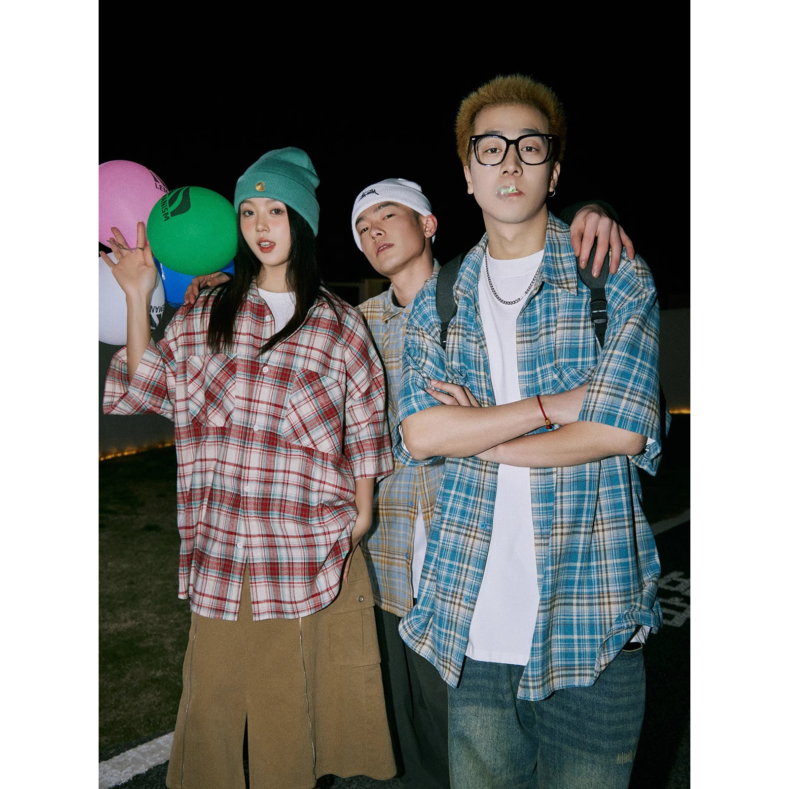 日系小众格纹短袖衬衫男士夏季新款宽松潮牌百搭衬衣情侣外套上衣