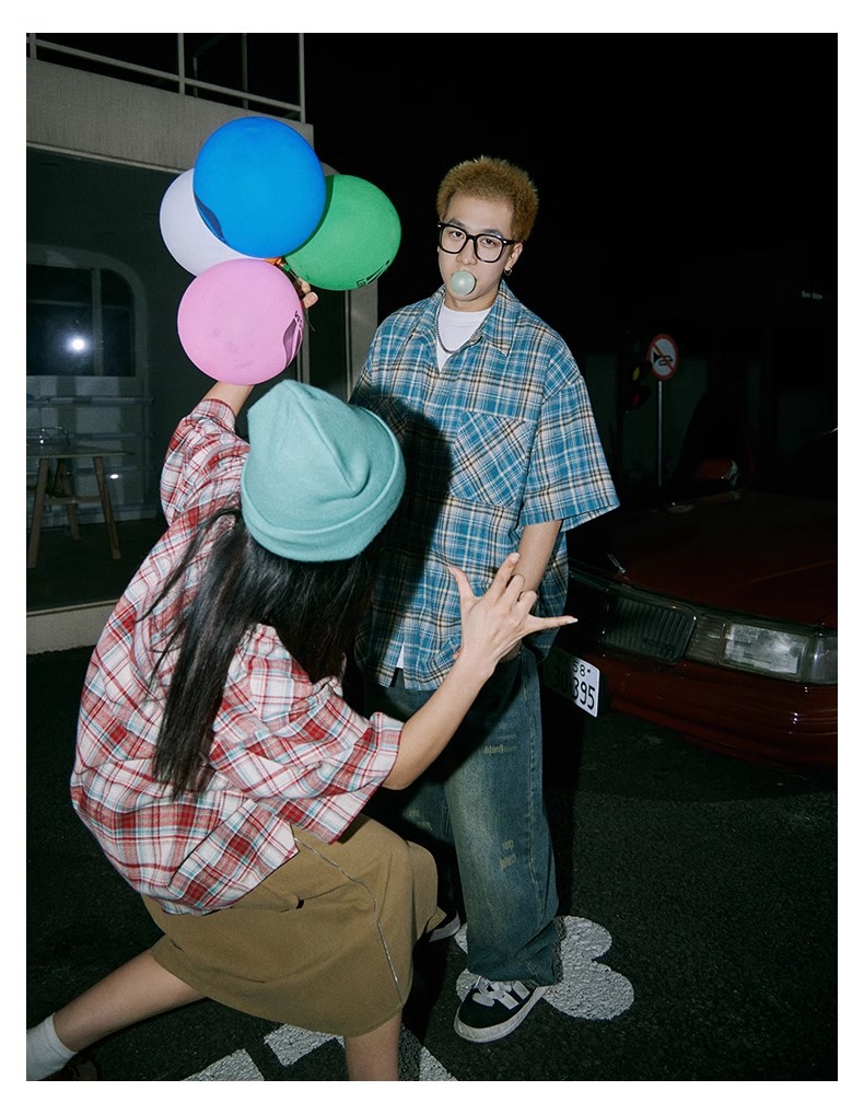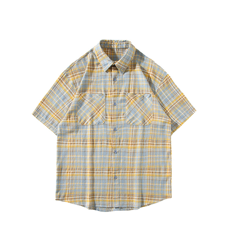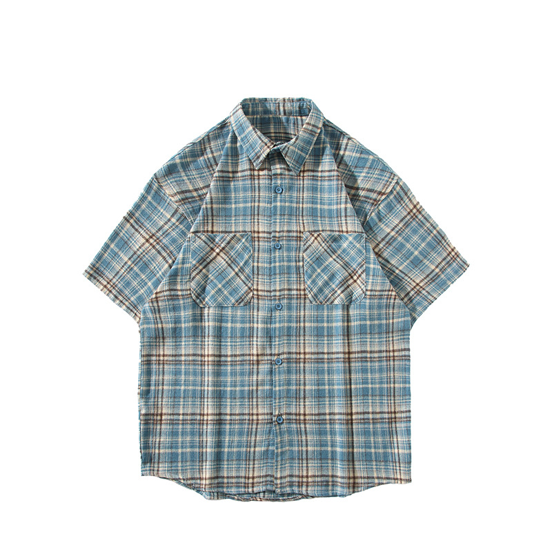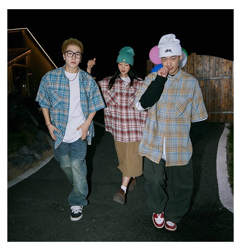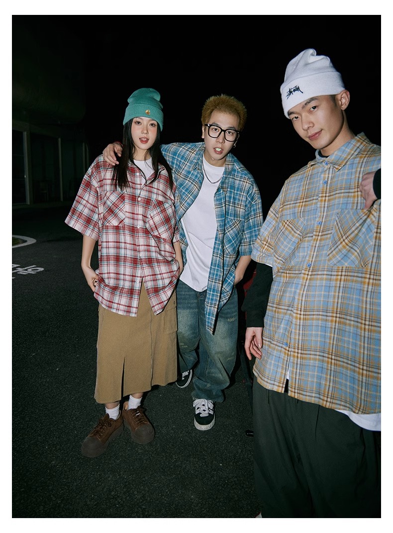 日系小众格纹短袖衬衫男士夏季新款宽松潮牌百搭衬衣情侣外套上衣