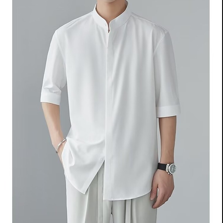 新中式立领短袖衬衫男士夏季新款小众衬衣高级感冰丝垂感中袖衬衫
