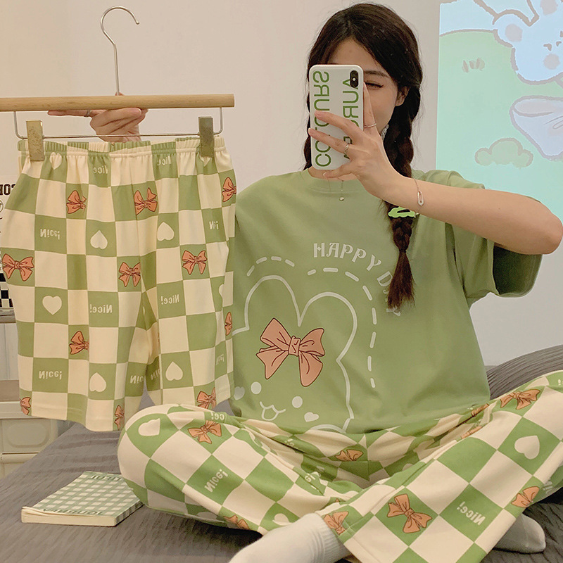 纯棉睡衣女夏季短袖长裤三件套新款甜美套头大码家居服夏天