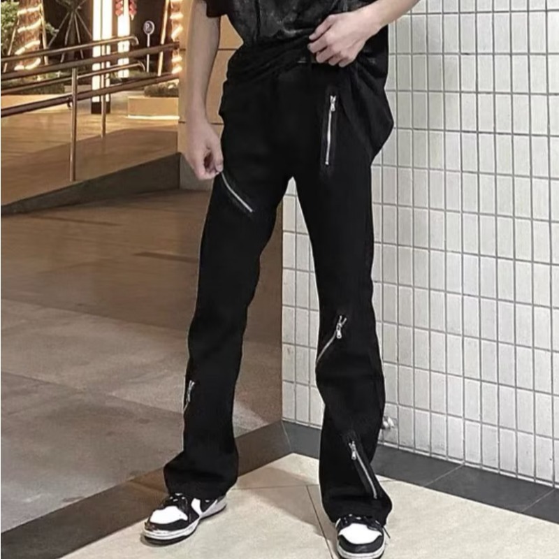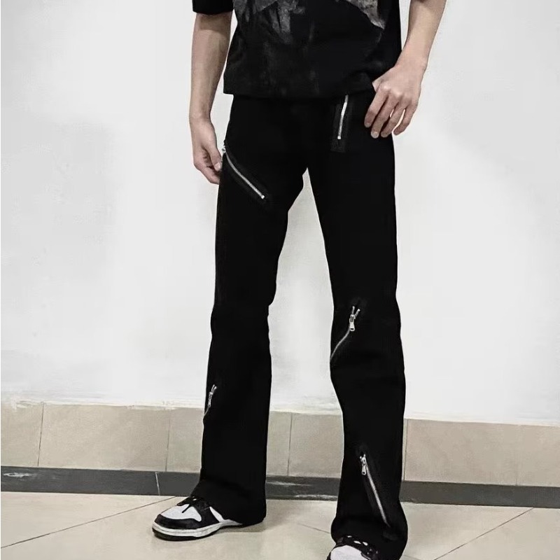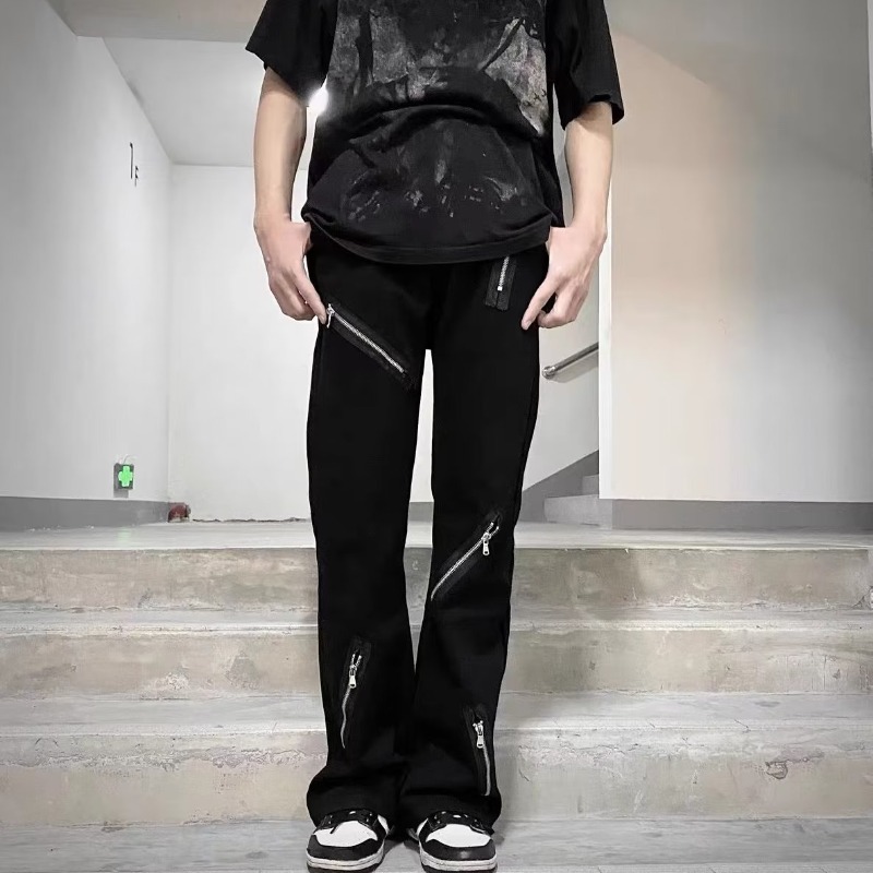 欧美炸街vibe暗黑风机能拉链牛仔裤男高街设计感微喇裤子休闲长裤