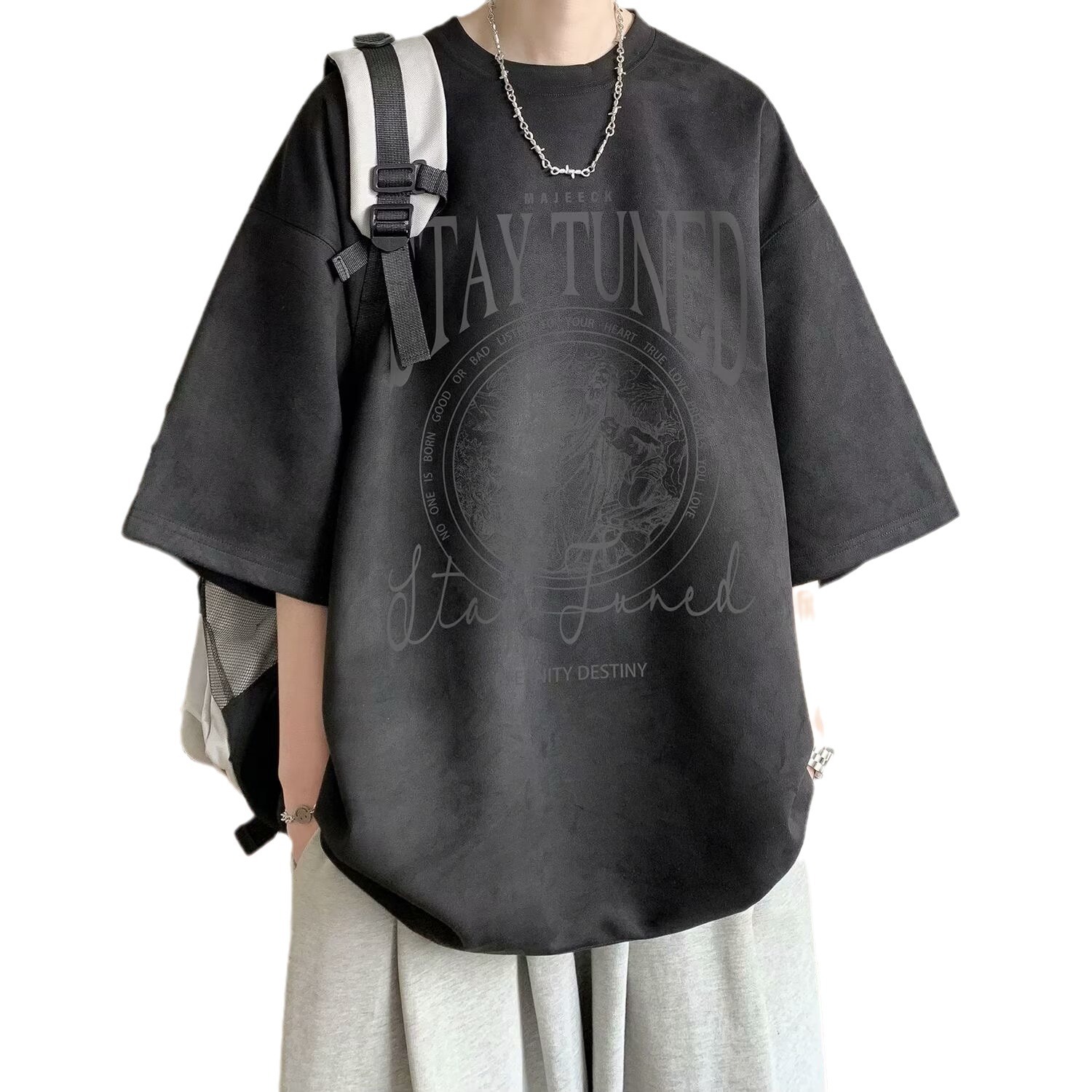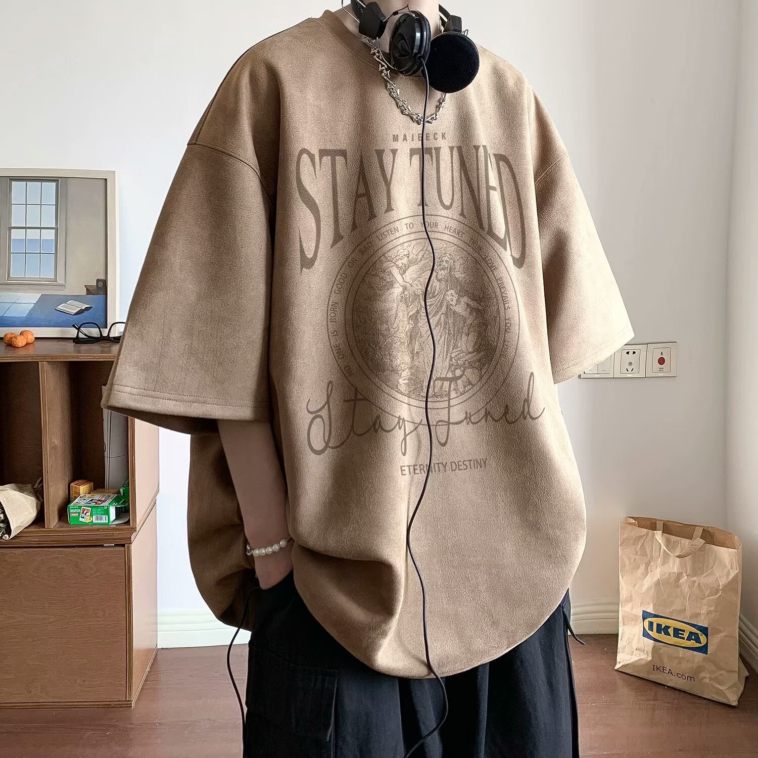 麂皮绒短袖t恤男夏季新款美式复古体恤男生潮牌重磅半袖衣服