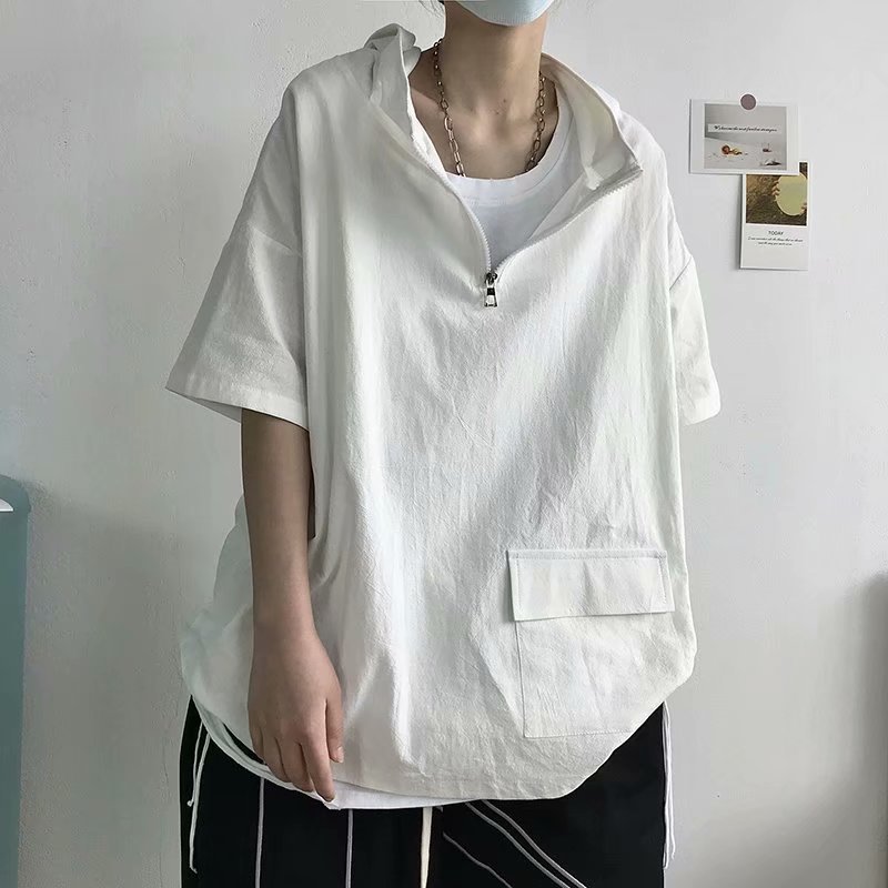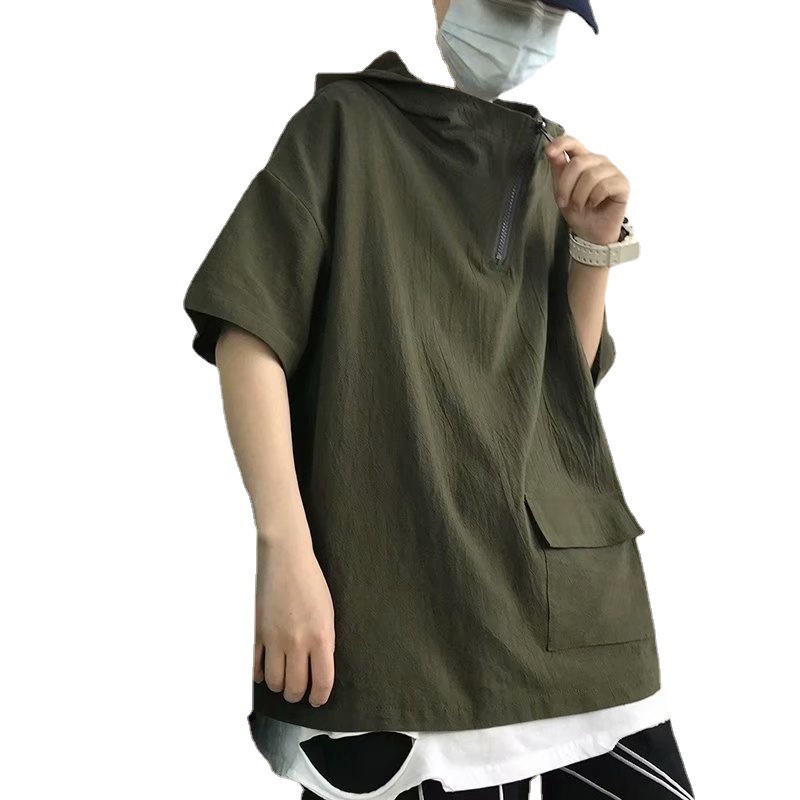 夏季短袖t恤男潮牌潮流宽松半袖连帽上衣港风休闲学生半高领卫衣
