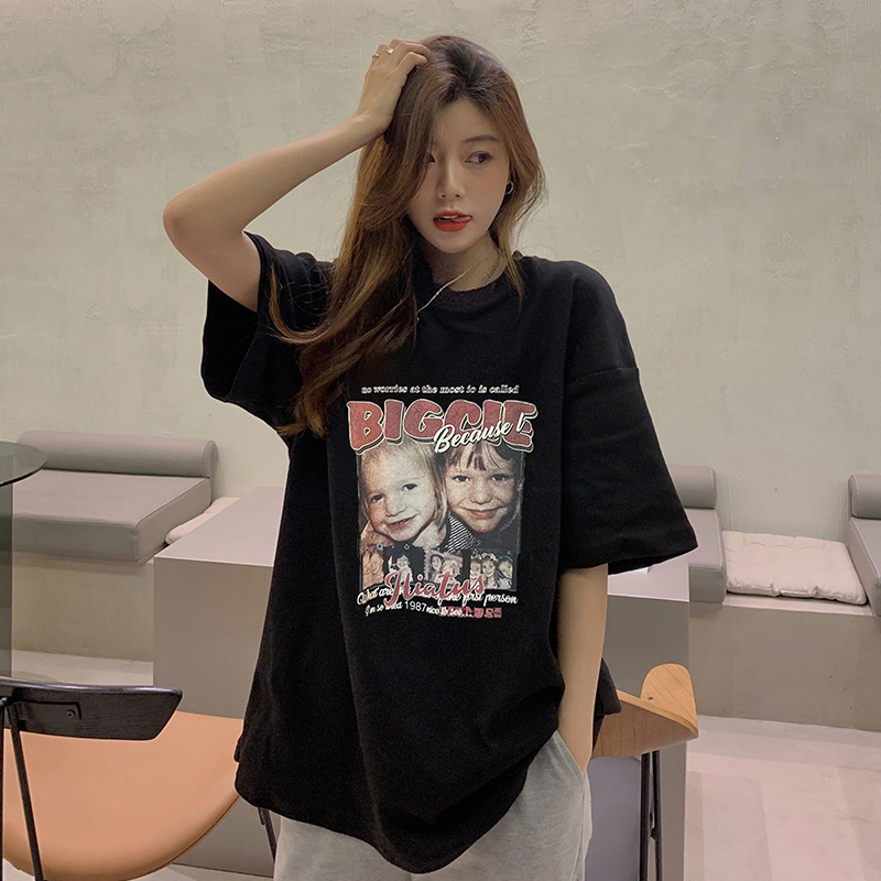 美式印花纯棉短袖T恤夏季新款宽松百搭情侣上衣欧美潮流大码女装