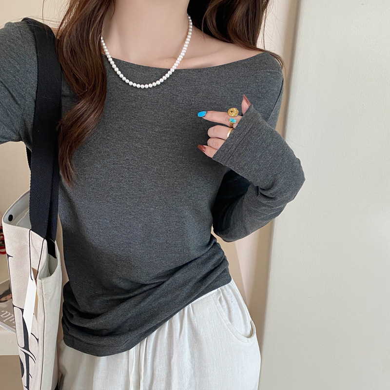甜辣一字肩长袖打底衫露肩T恤女早秋新款荡领设计感修身斜肩上衣