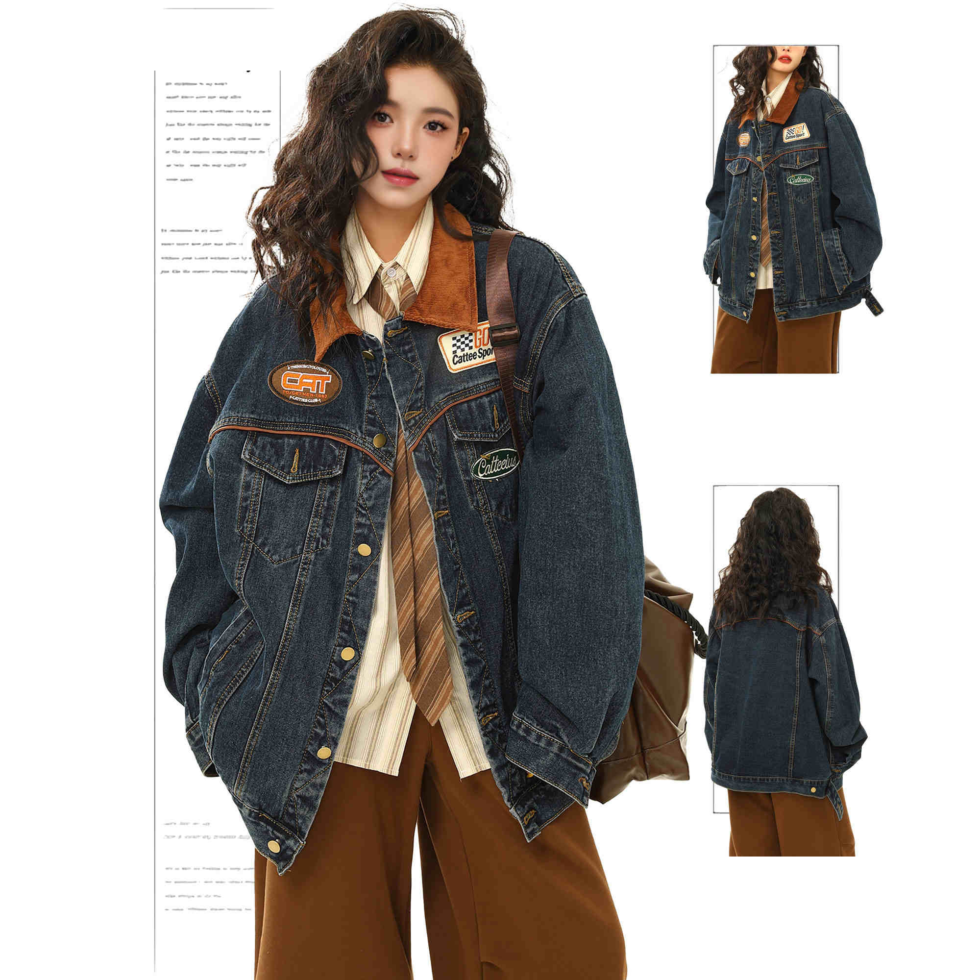 春秋新款美式复古牛仔外套男女机车贴标潮牌翻领高街夹克宽松上衣