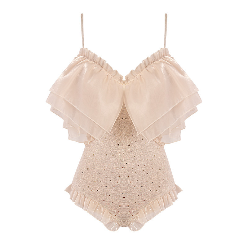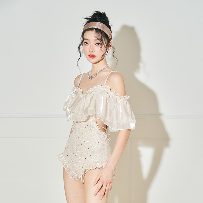 新款连体泳衣女一字肩荷叶边性感吊带遮肚显瘦仙女范度假温泉泳装