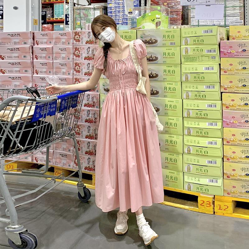 粉色法式甜美高腰纯色连衣裙夏季女新款一字肩可爱优雅仙女裙