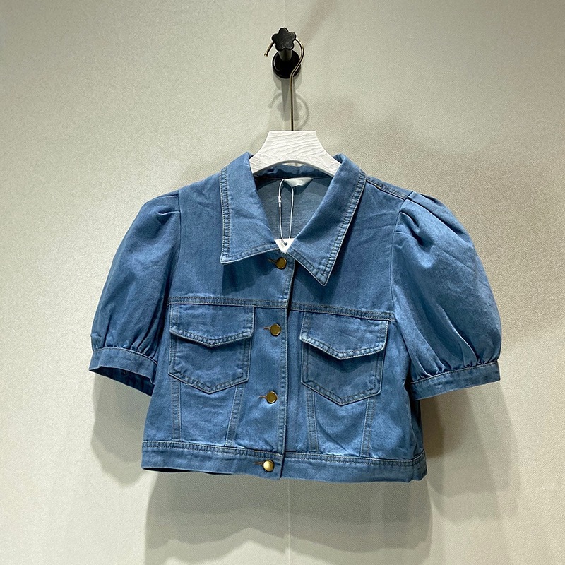 夏季新款泡泡袖双口袋单排扣POLO领短款牛仔衬衫女