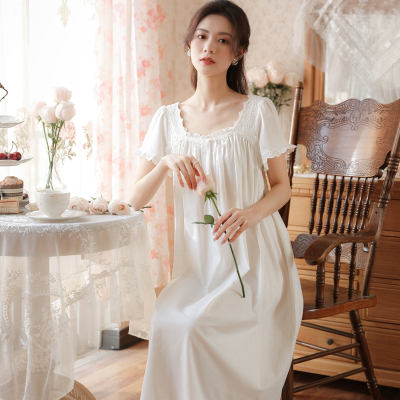 睡裙短袖棉夏新品长款法式复古公主风蕾丝甜美女家居睡衣