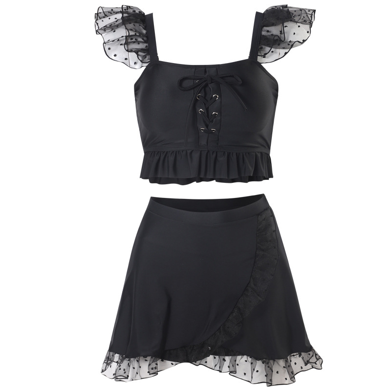 纯色温泉分体泳衣女两件套抽绳荷叶边小清新保守游泳衣套装新款