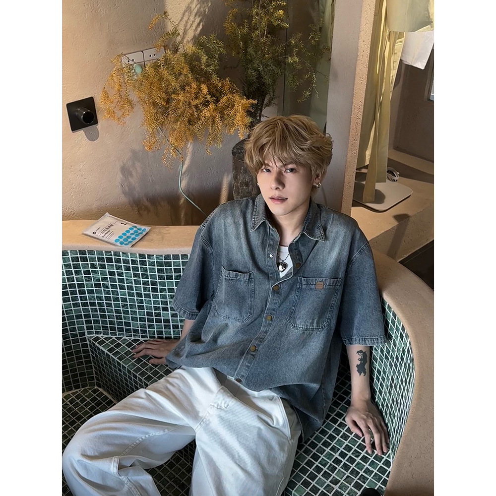 美式潮牌小众复古洗水牛仔短袖衬衫男夏季新款日系宽松休闲外套潮