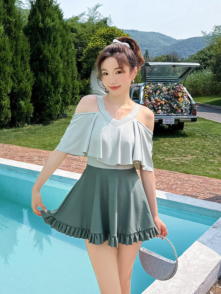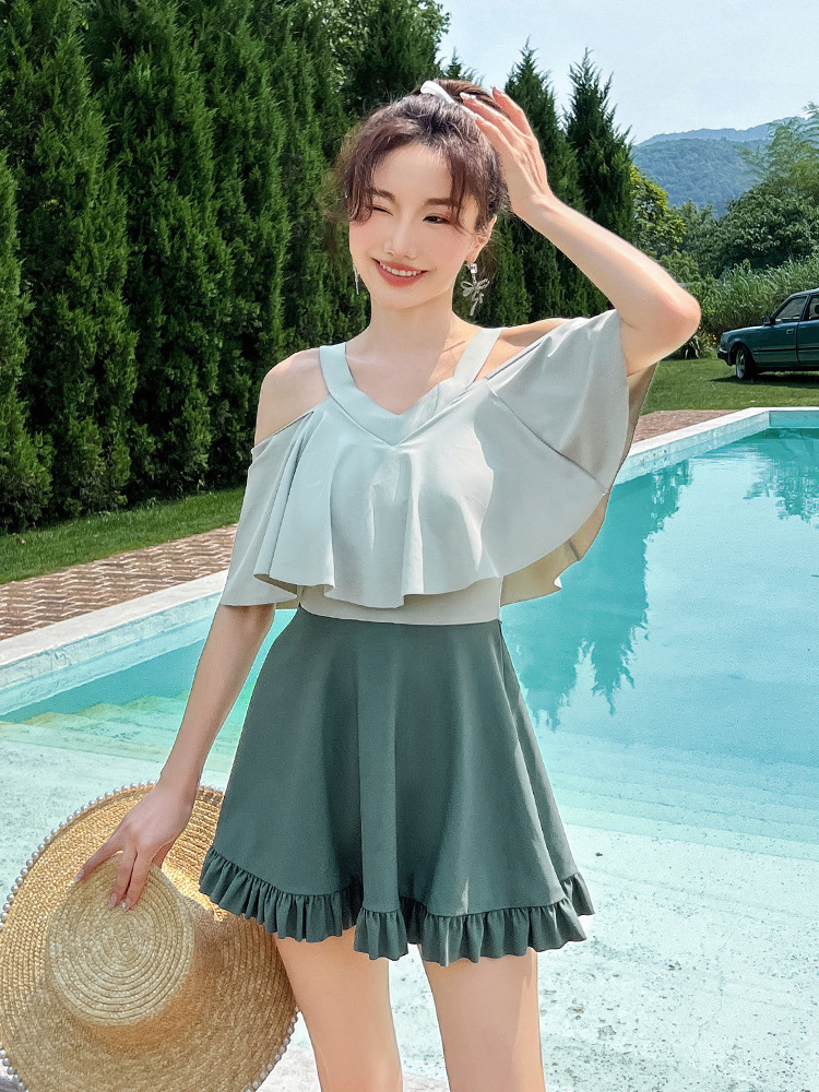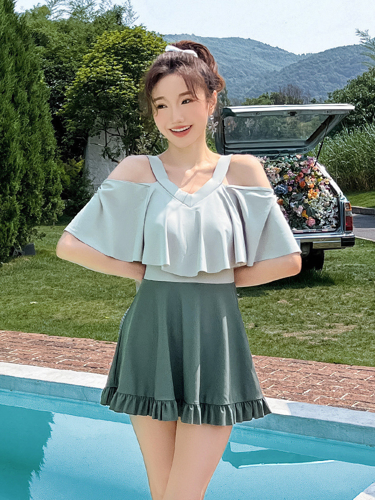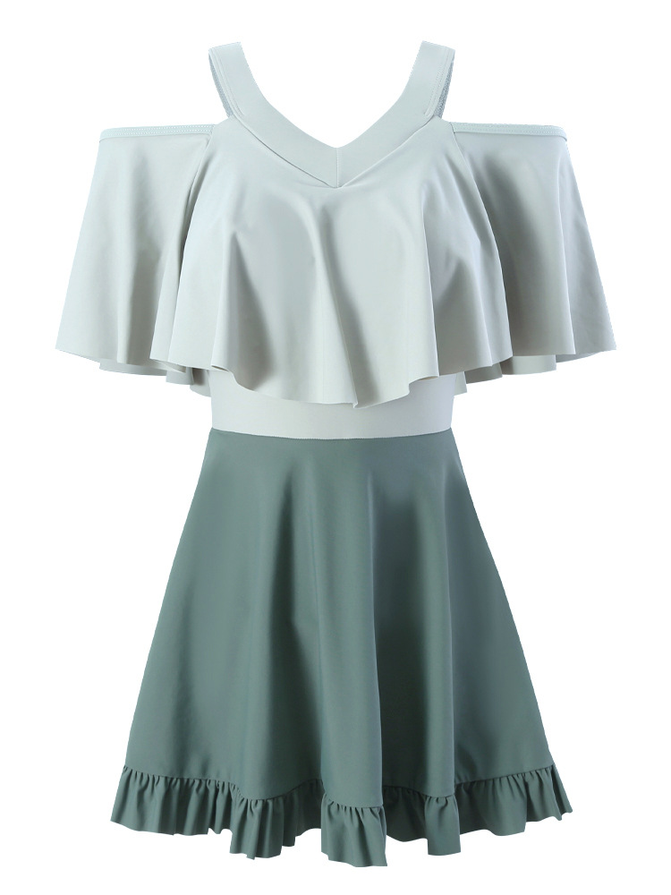 新款泳衣女连体裙式显瘦遮肚荷叶边遮手臂保守时尚游泳衣批发泳装