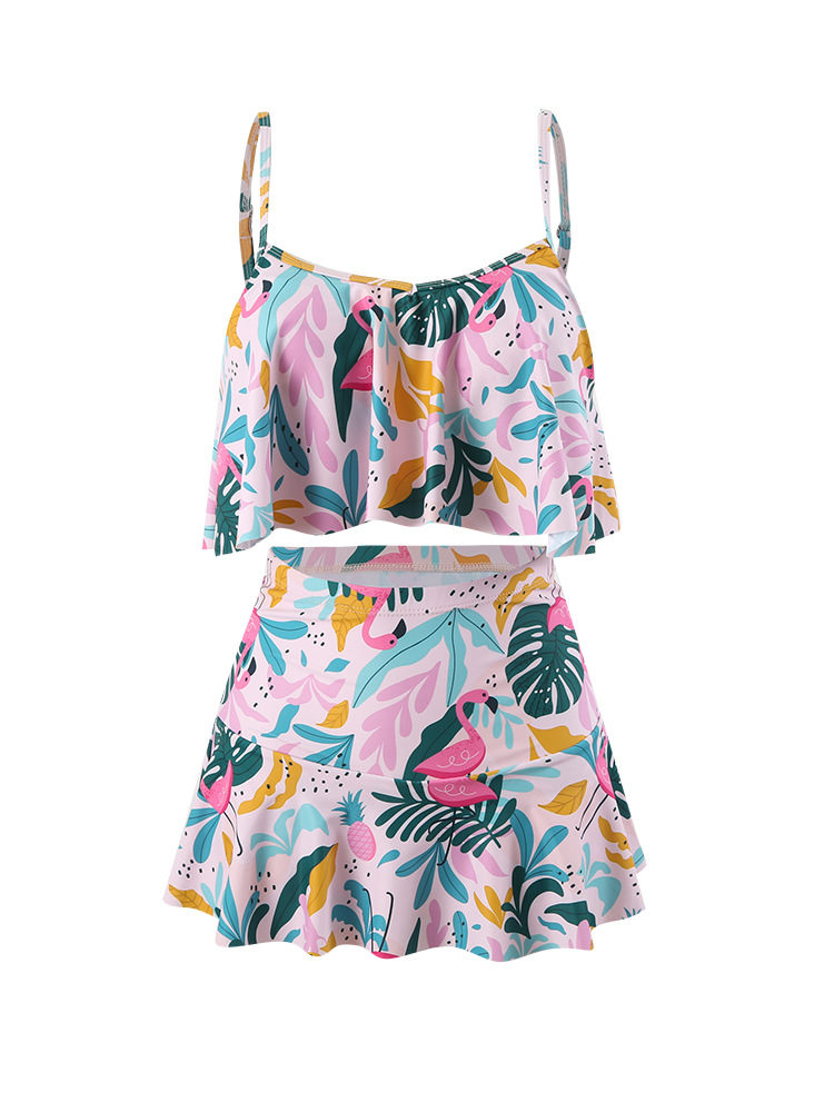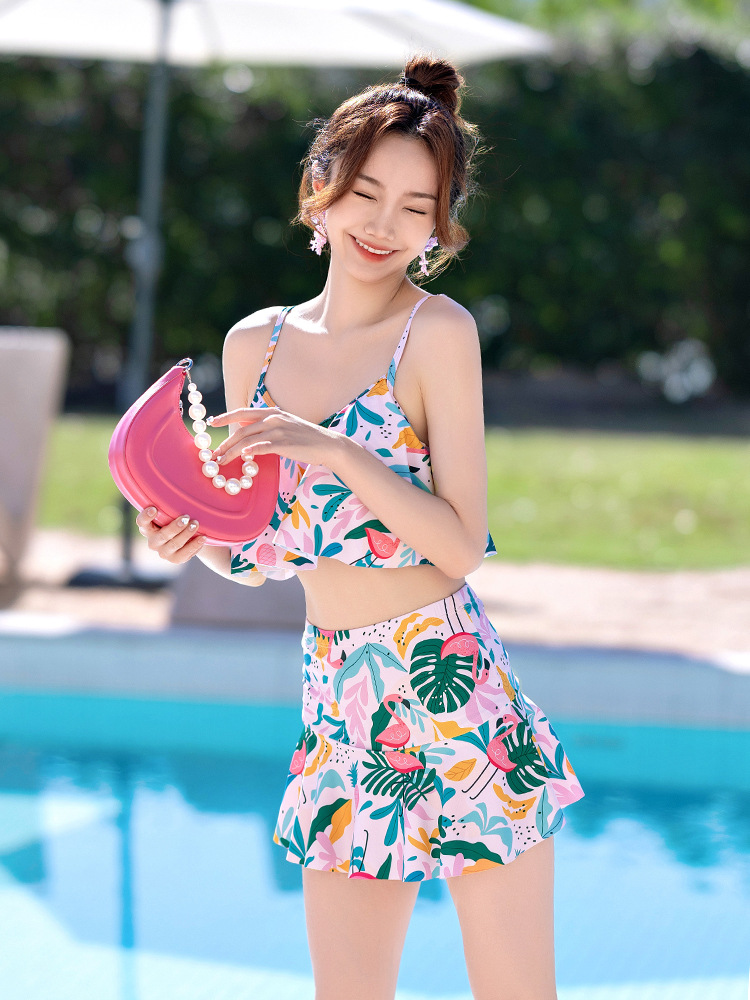 新款夏粉红少女四件套泳衣女分体绑带裙式温泉度假比基尼纯欲