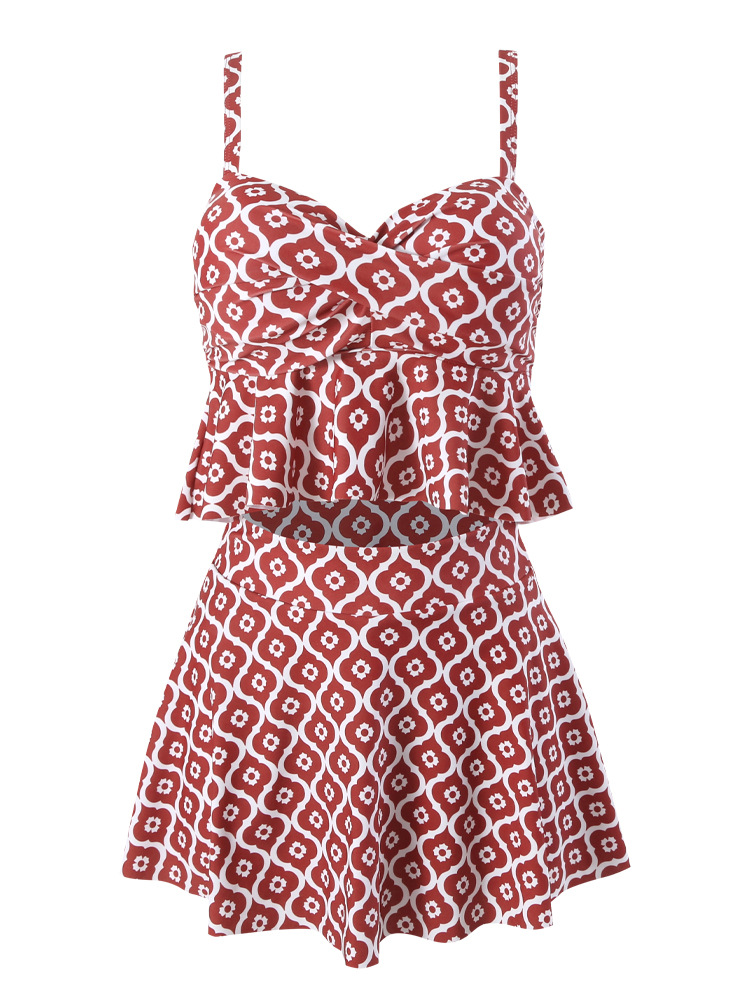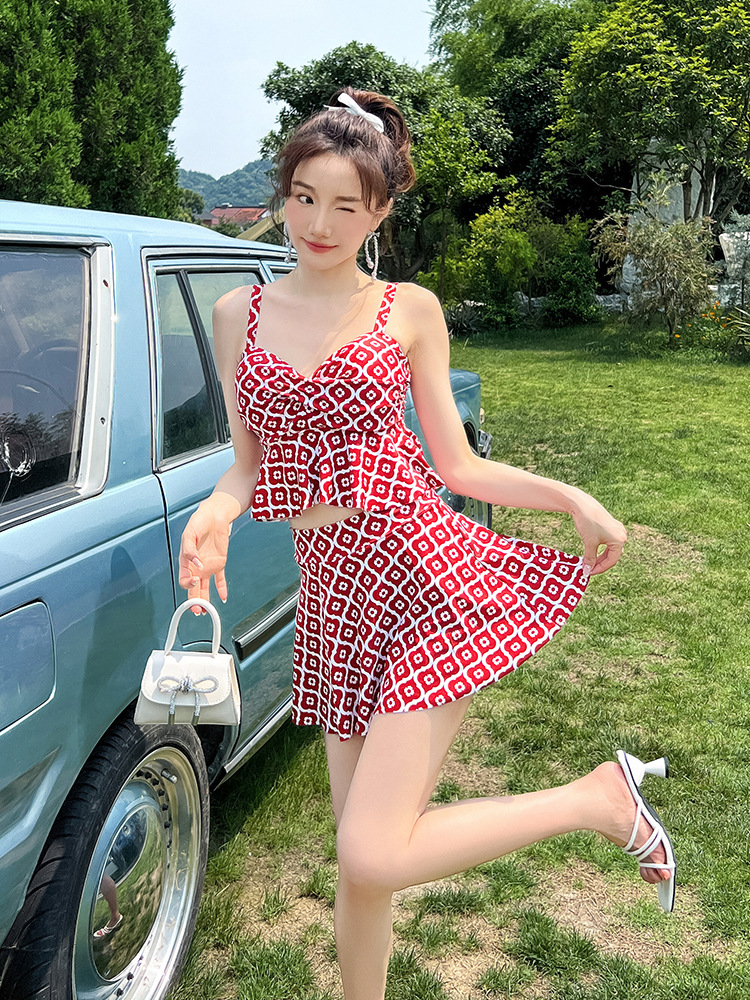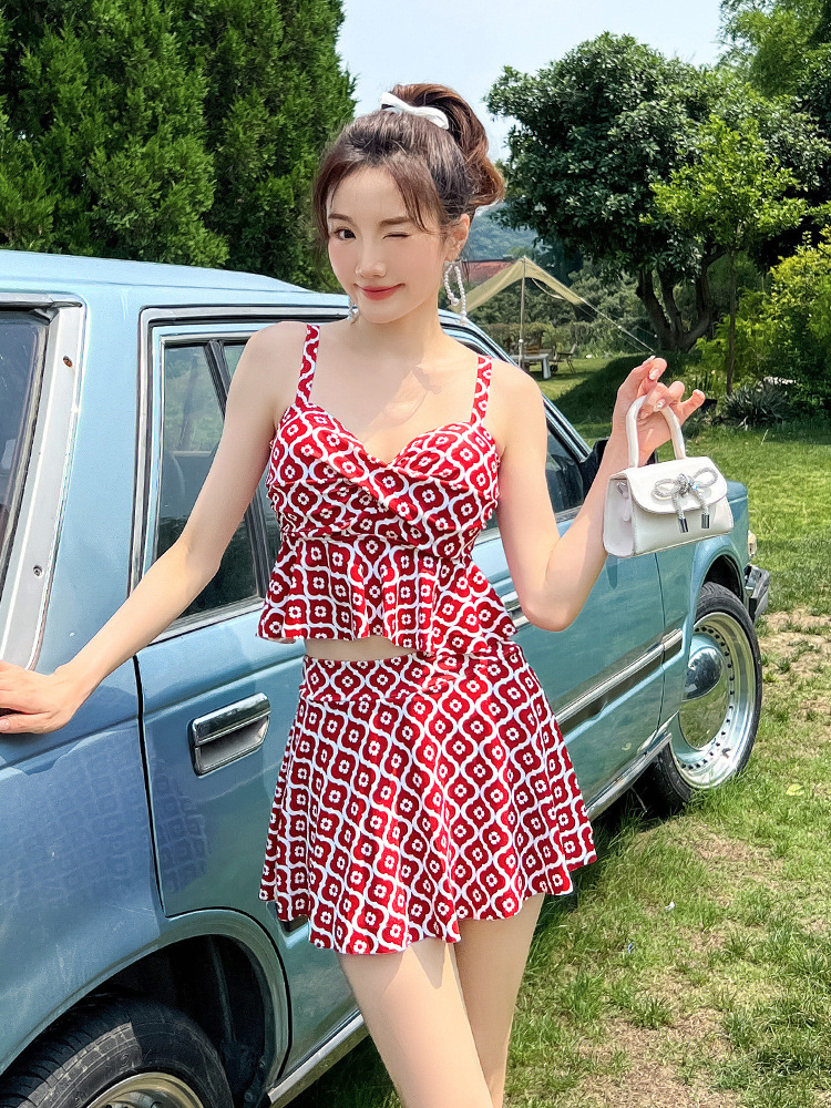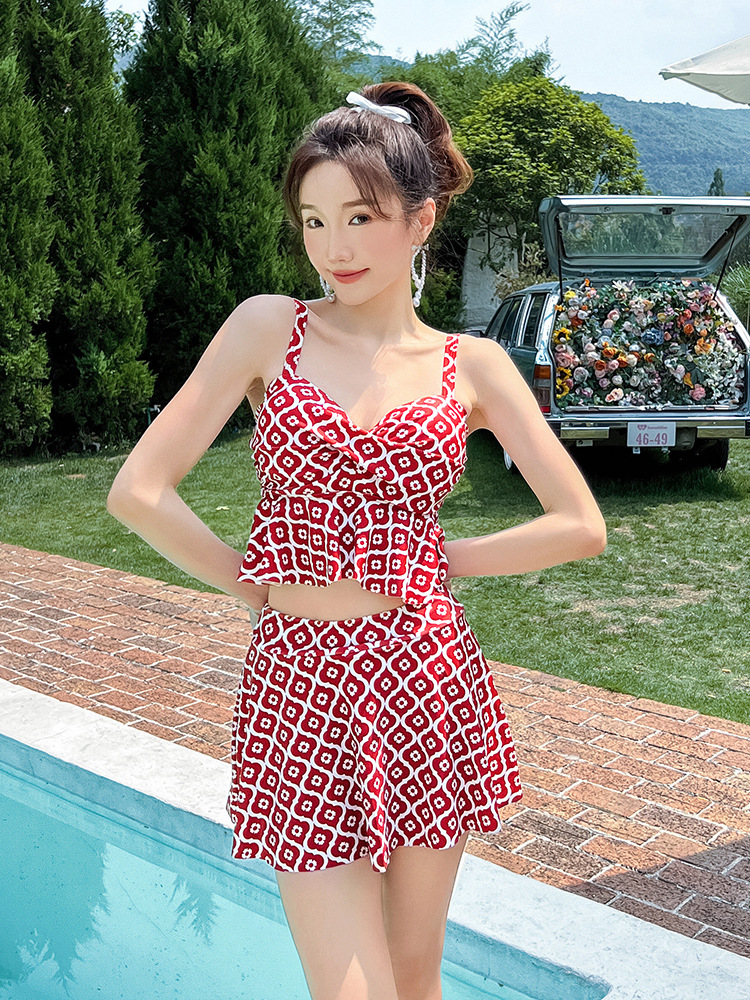 新款泳衣女分体裙式钢托聚拢显瘦遮肚保守红色印花泡温泉泳装