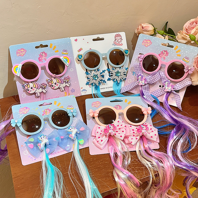 儿童墨镜夏季新款库洛米假发辫子卡通女童发夹太阳镜宝宝眼镜