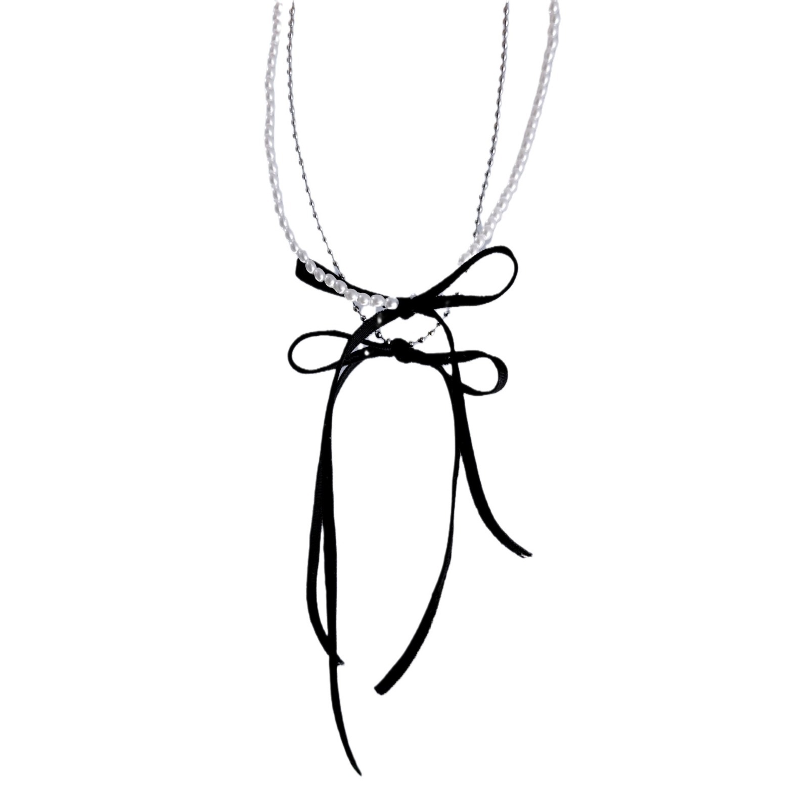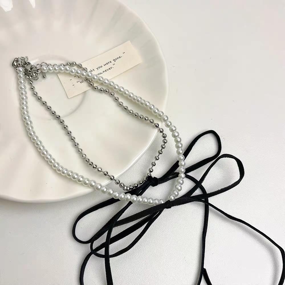 韩国简约甜美双层珍珠蝴蝶结流苏项链饰品女百搭高级感串珠锁骨链