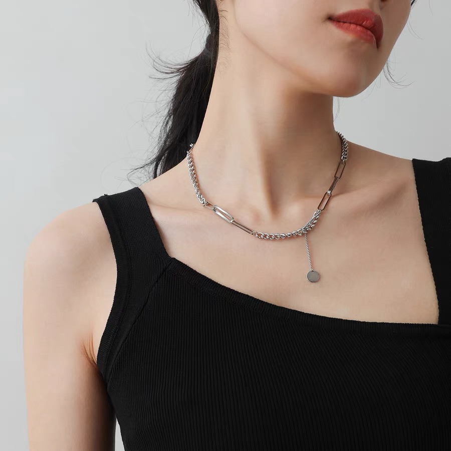 简约嘻哈不对称金属钛钢项链饰品女夏季不掉色几何链条拼接锁骨链