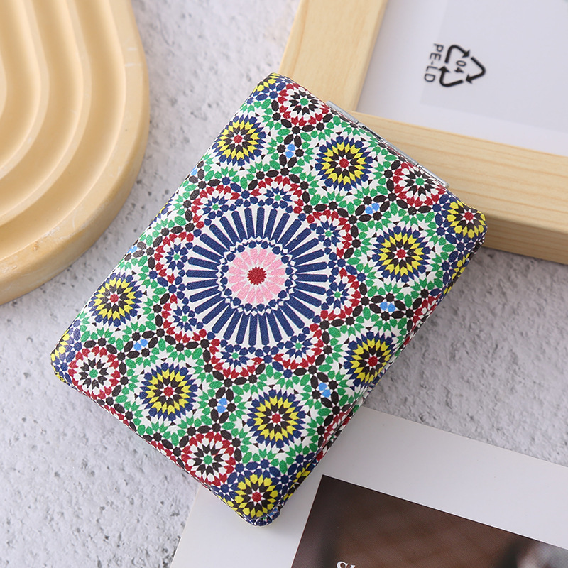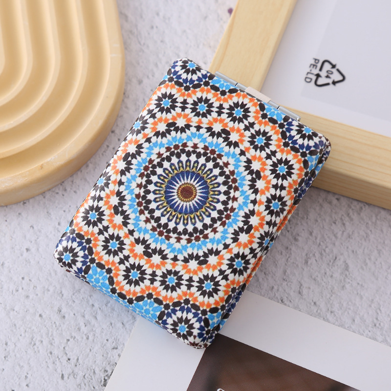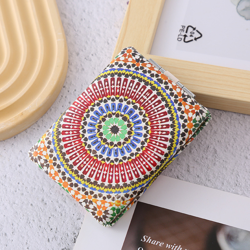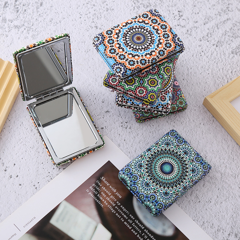 化妆折叠镜长方形面包镜复古风波西米亚风便携厚款双面pu口袋镜