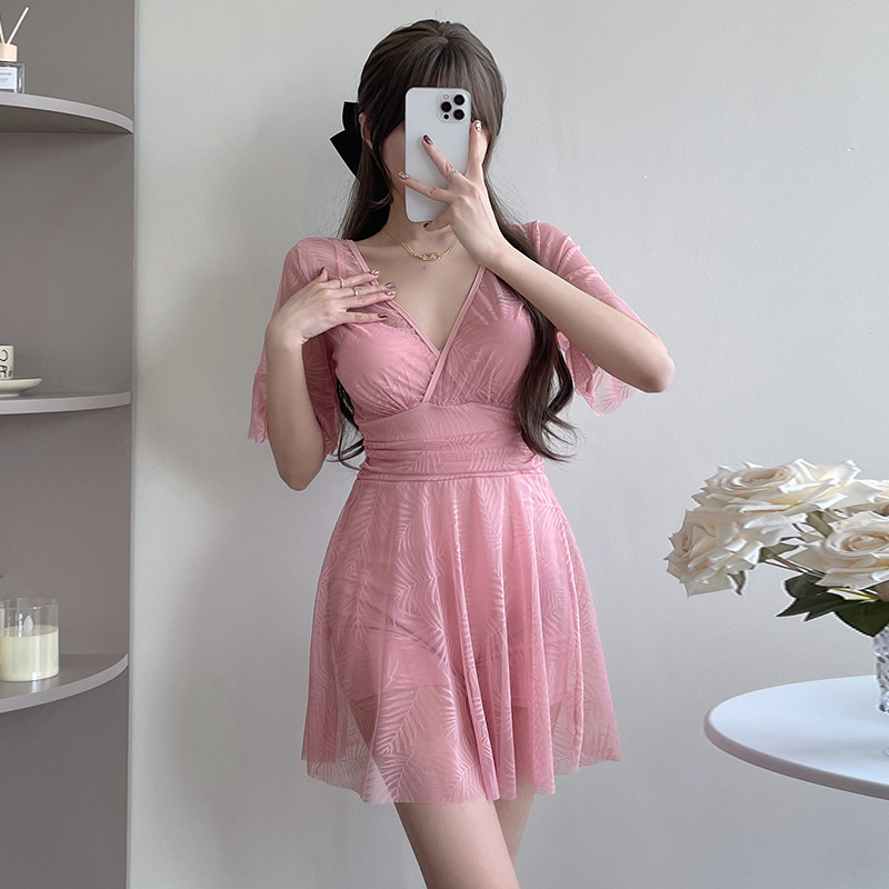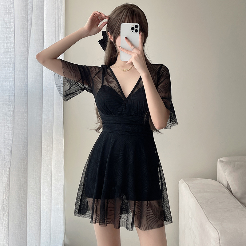 泳衣女款连体纯色蕾丝气质裙式钢托保守显瘦遮肉休闲温泉泳衣