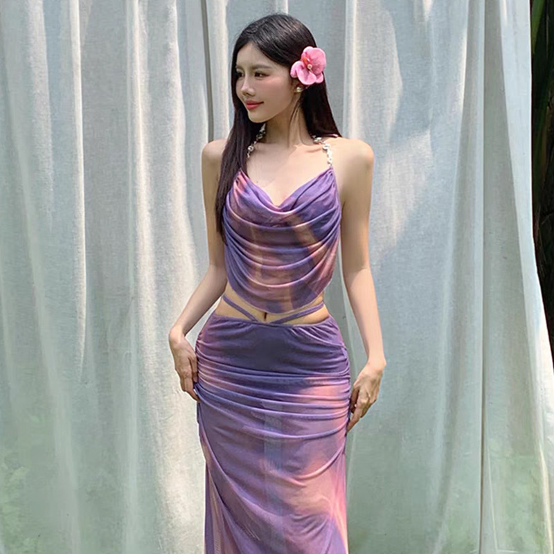 比基尼泳衣三件套长裙时尚扎染性感修身钢托聚拢温泉泳衣