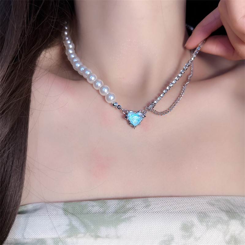 轻奢双层幻彩水晶爱心项链女温柔高级串珍珠拼接多巴胺饰品锁骨链