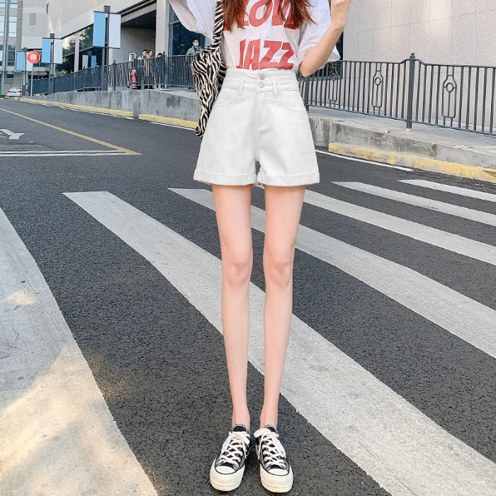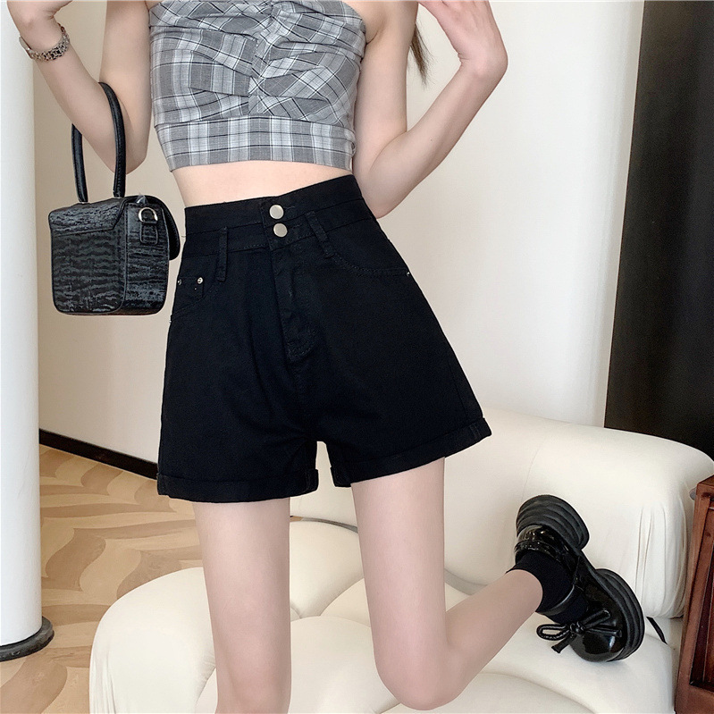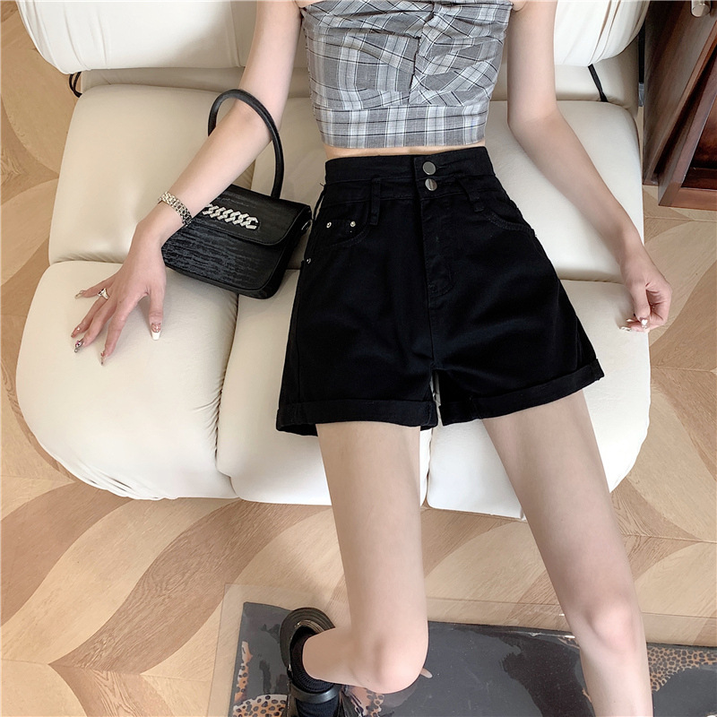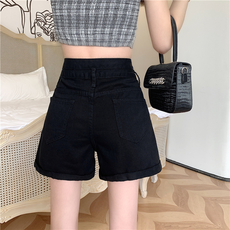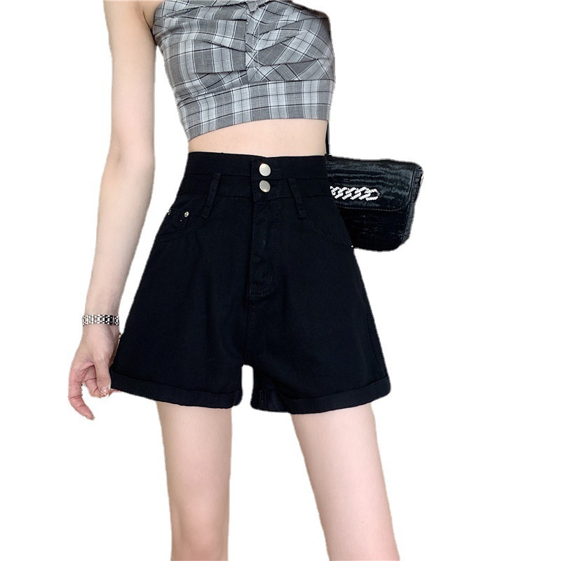 卷边牛仔短裤女夏季新款韩版高腰宽松显瘦双扣a字直简阔腿热裤外