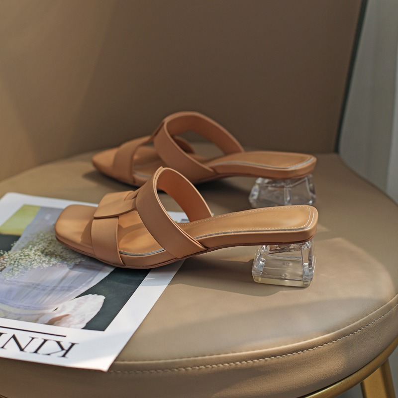 家法式网红凉拖鞋女夏新款外穿真软皮粗跟方头露趾凉鞋