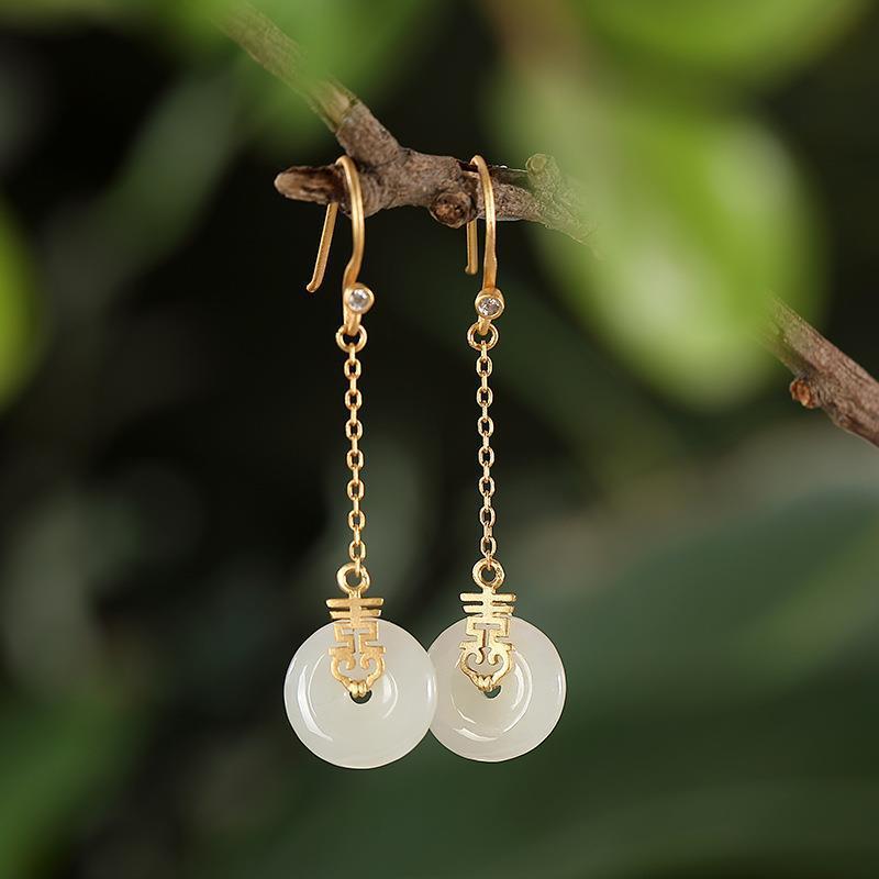 纯银复古法金镶和田玉平安扣耳环宫廷中国风长款气质耳坠旗袍耳饰