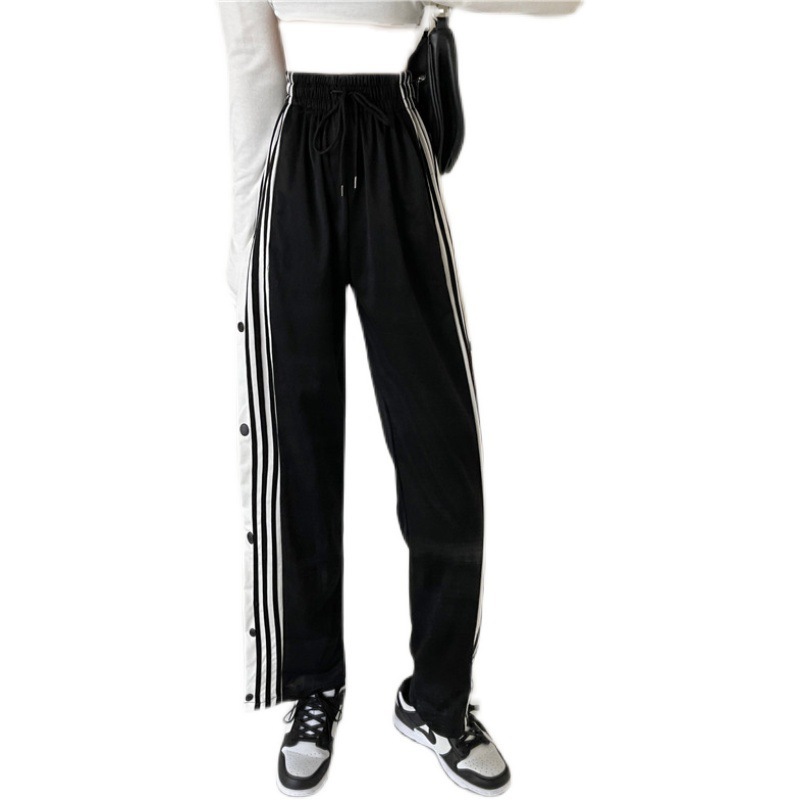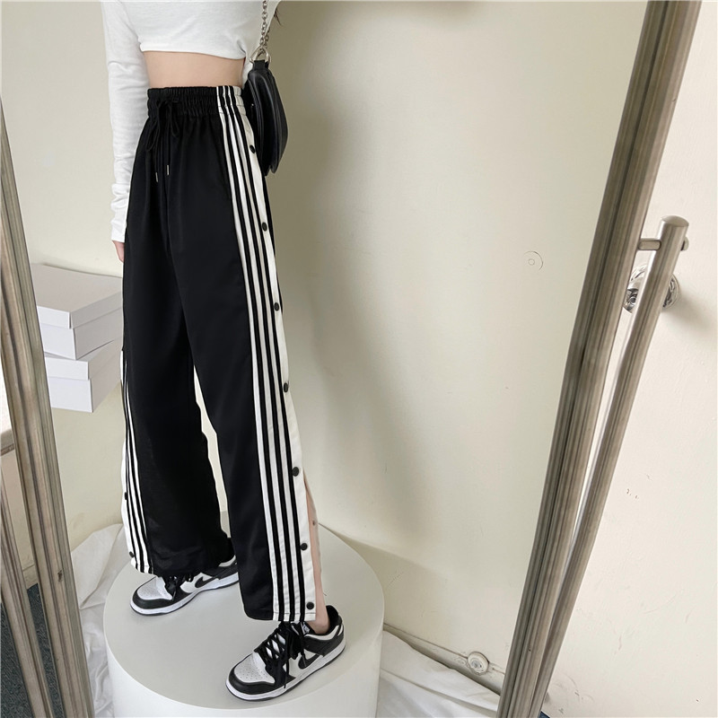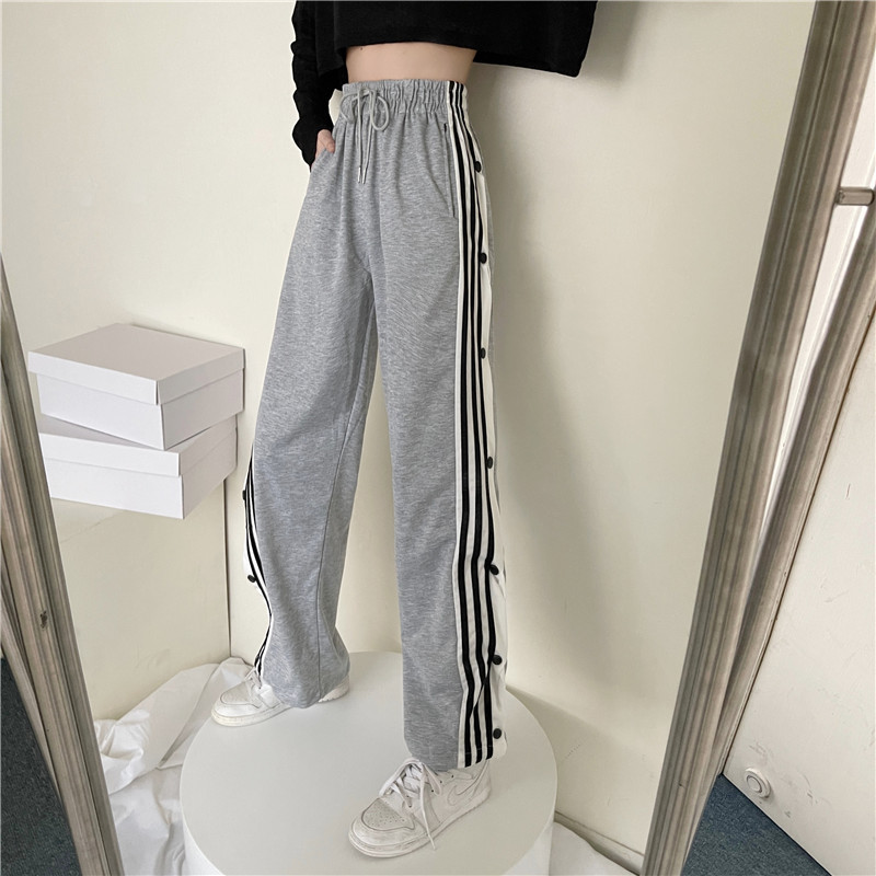 休闲阔腿长裤女秋季新款韩版纽扣宽松学生开叉裤女装