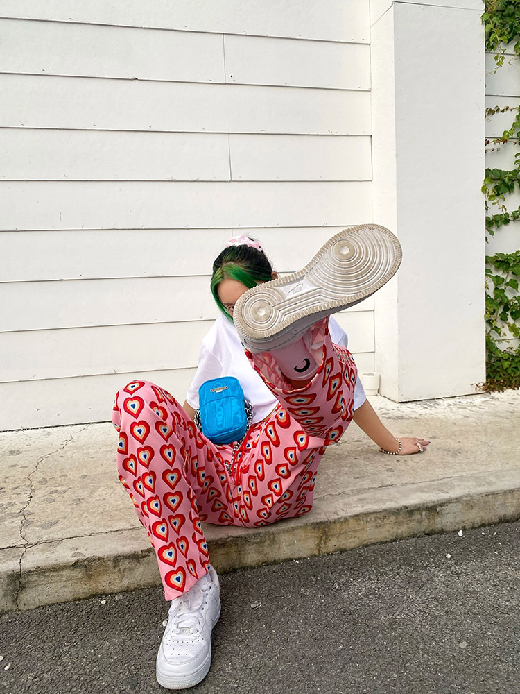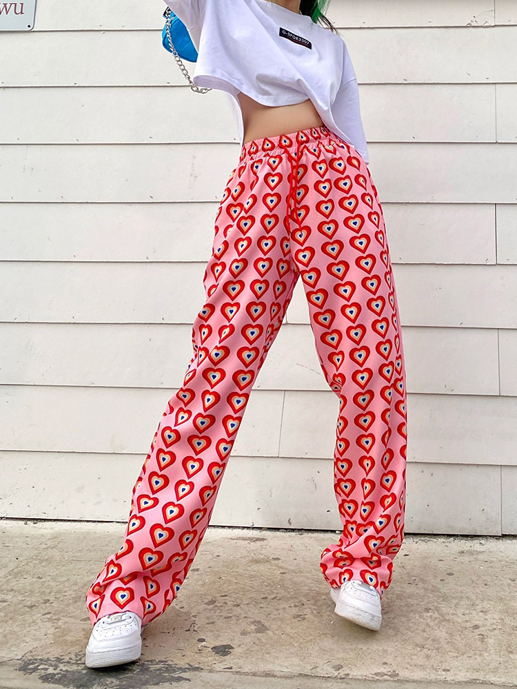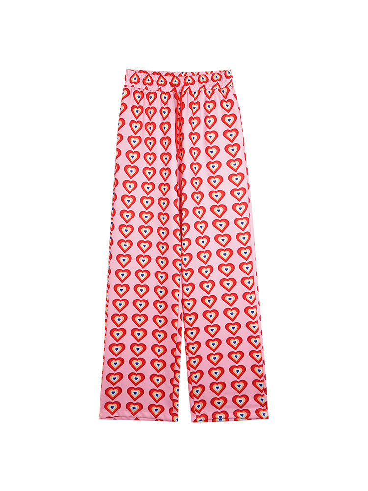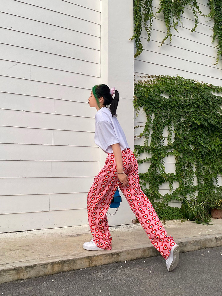 泰国爆 心形印花高腰抽绳宽松显瘦垂感阔腿裤长裤女薄款